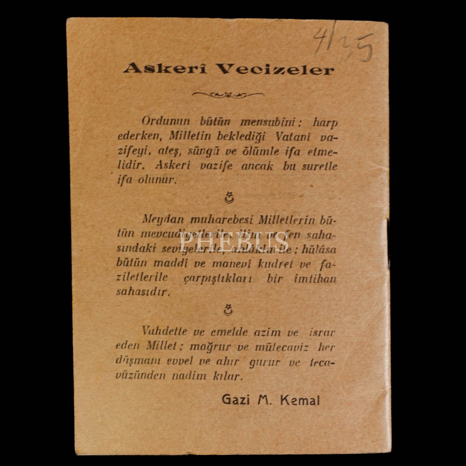 Defterin arka kapağında, Mustafa Kemal Atatürk´ün askerliğe dair üç vecizesi yer almaktadır: 1) "Ordunun bütün mensubini; harp ederken, Milletin beklediği Vatanî vazifeyi, ateş, süngü ve ölümle ifa etmelidir. Askeri vazife ancak bu suretle ifa olunur." 2) "Meydan muharebesi Milletlerin bütün mevcudiyetlerile, ilim ve fen sahasındaki seviyelerile, ahlâklarile; hülâsa bütün maddî ve manevî kudret ve faziletlerile çarpıştıkları bir imtihan sahasıdır." 3) Vahdette ve emelde azim ve israr eden Millet; mağrur ve mütecaviz her düşmanı evvel ve ahır gurur ve tecavüzünden nadim kılar."