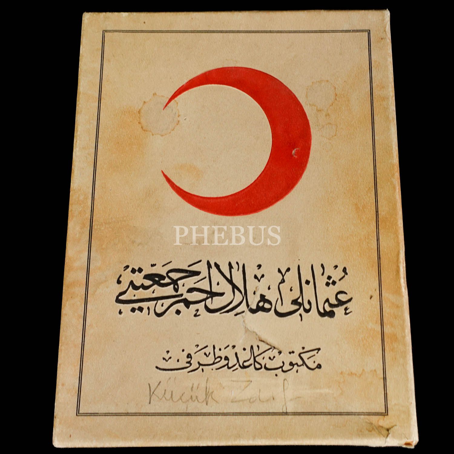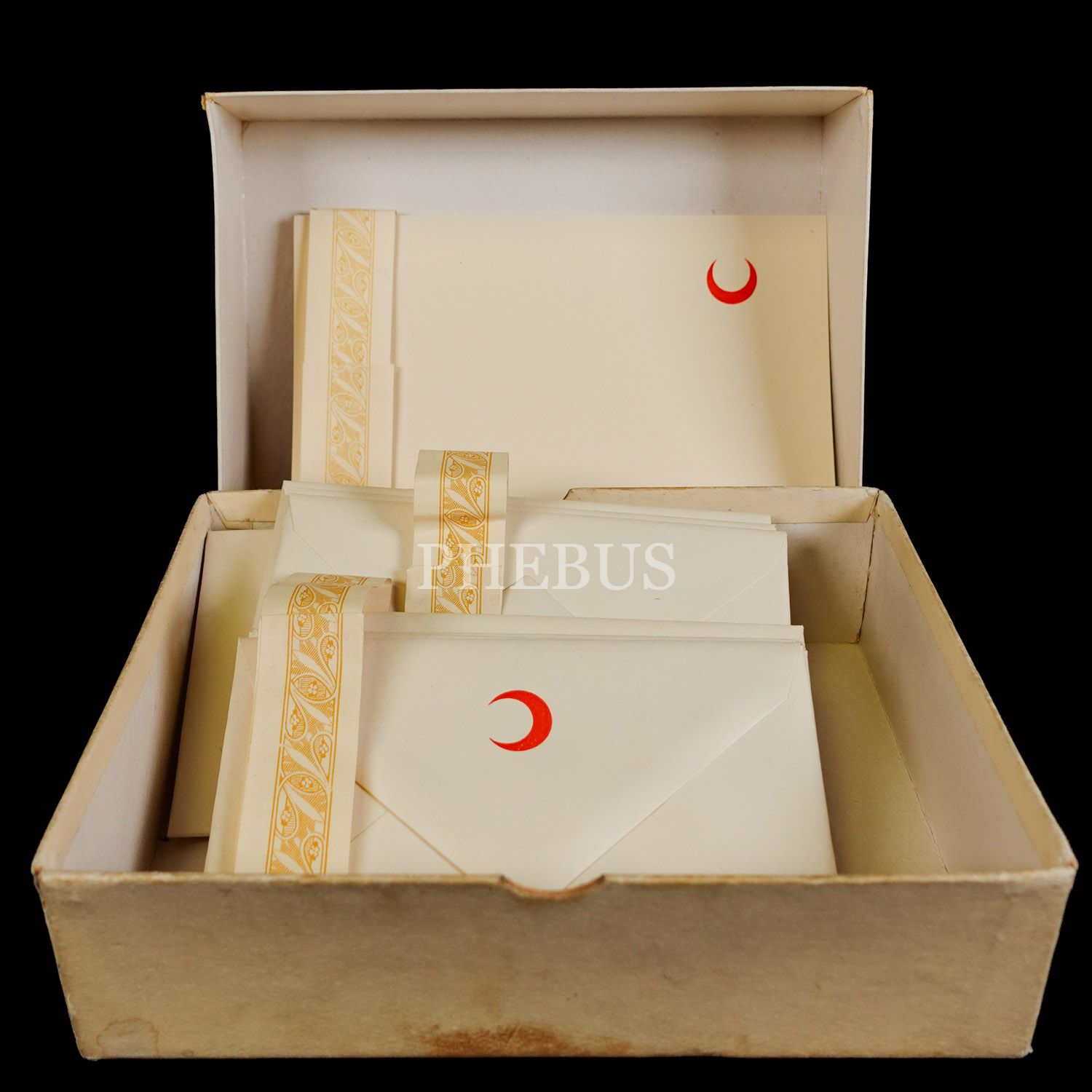 "Osmanlı Hilal-i Ahmer Cemiyeti Mektup Kağıdı ve Zarfı" yazılı orijinal karton kutusu, Hilal-i Ahmer antetli mektup kağıtları ve zarfları ile birlikte, 15x19x6 cm...