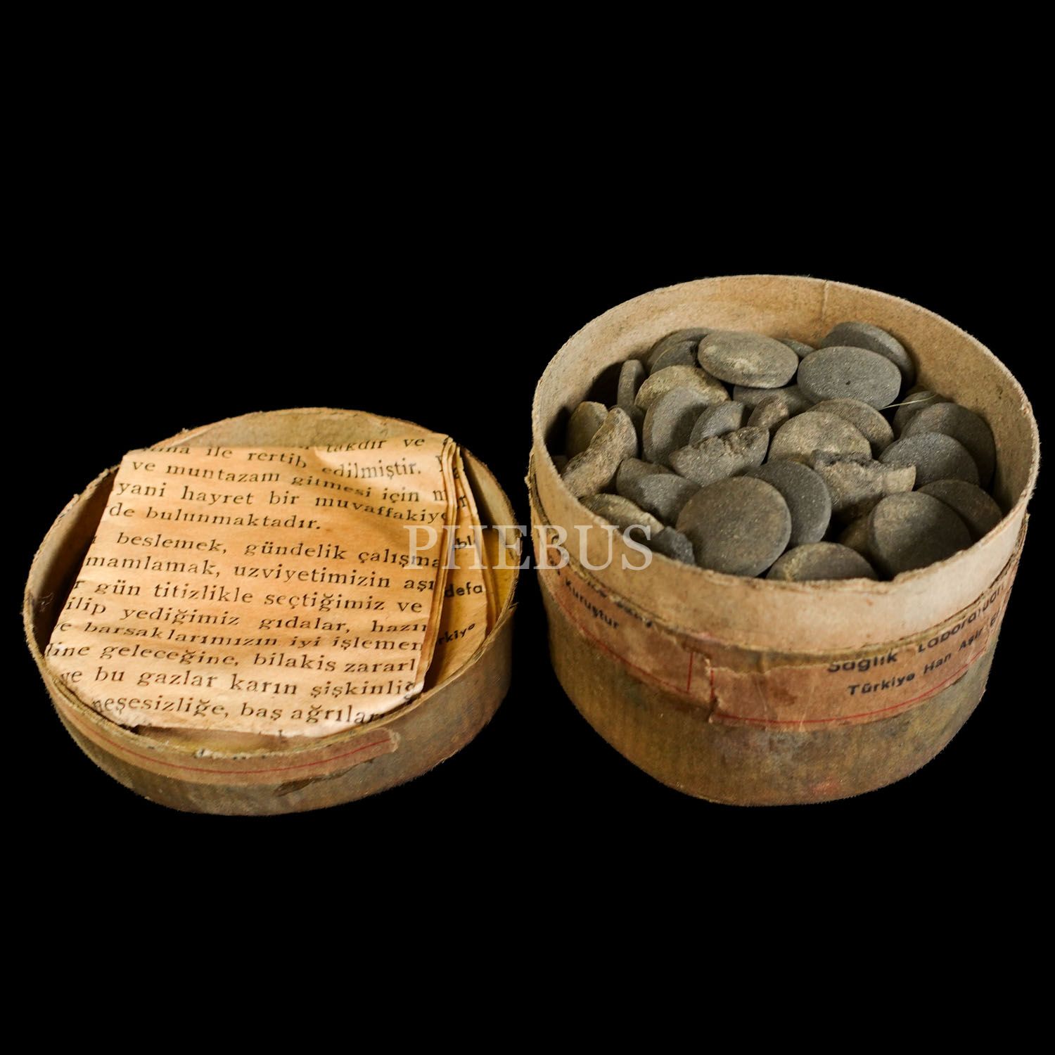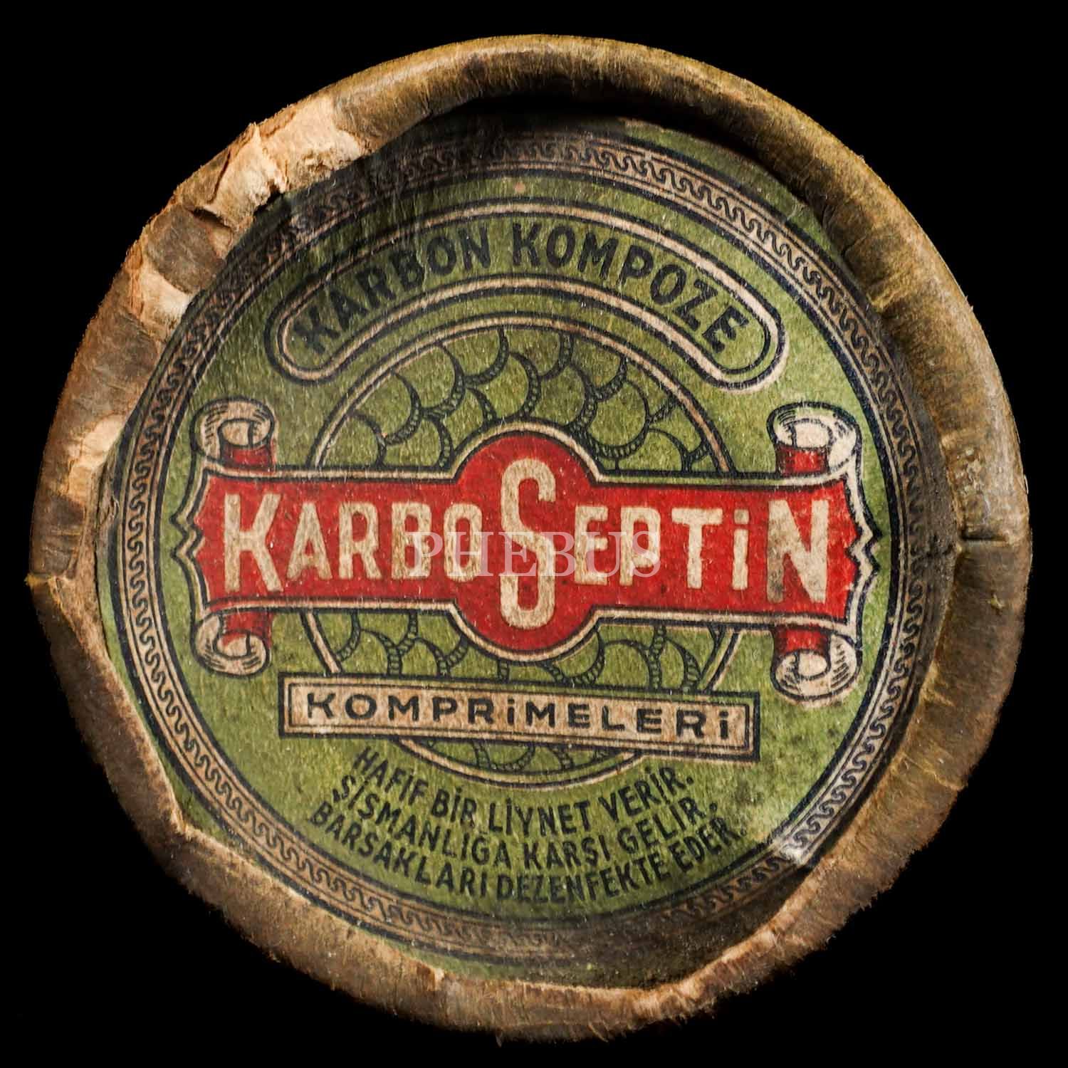 Prospektüsün de yer aldığı orijinal karton kutusunda Karboseptin Komprimeleri, Sağlık Laboratuarı, 1945 ruhsatlı, 7x5 cm...