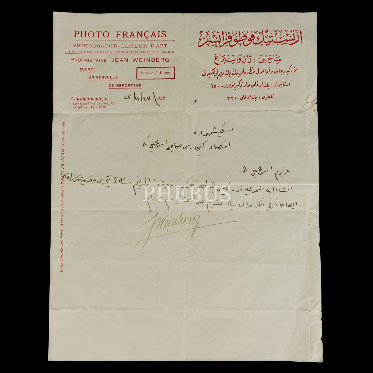 Photo Français´ın sahibi Jean Weinberg´in ıslak imzasını taşıyan Fransızca-Osmanlıca antetli mektup, 22x28 cm...
