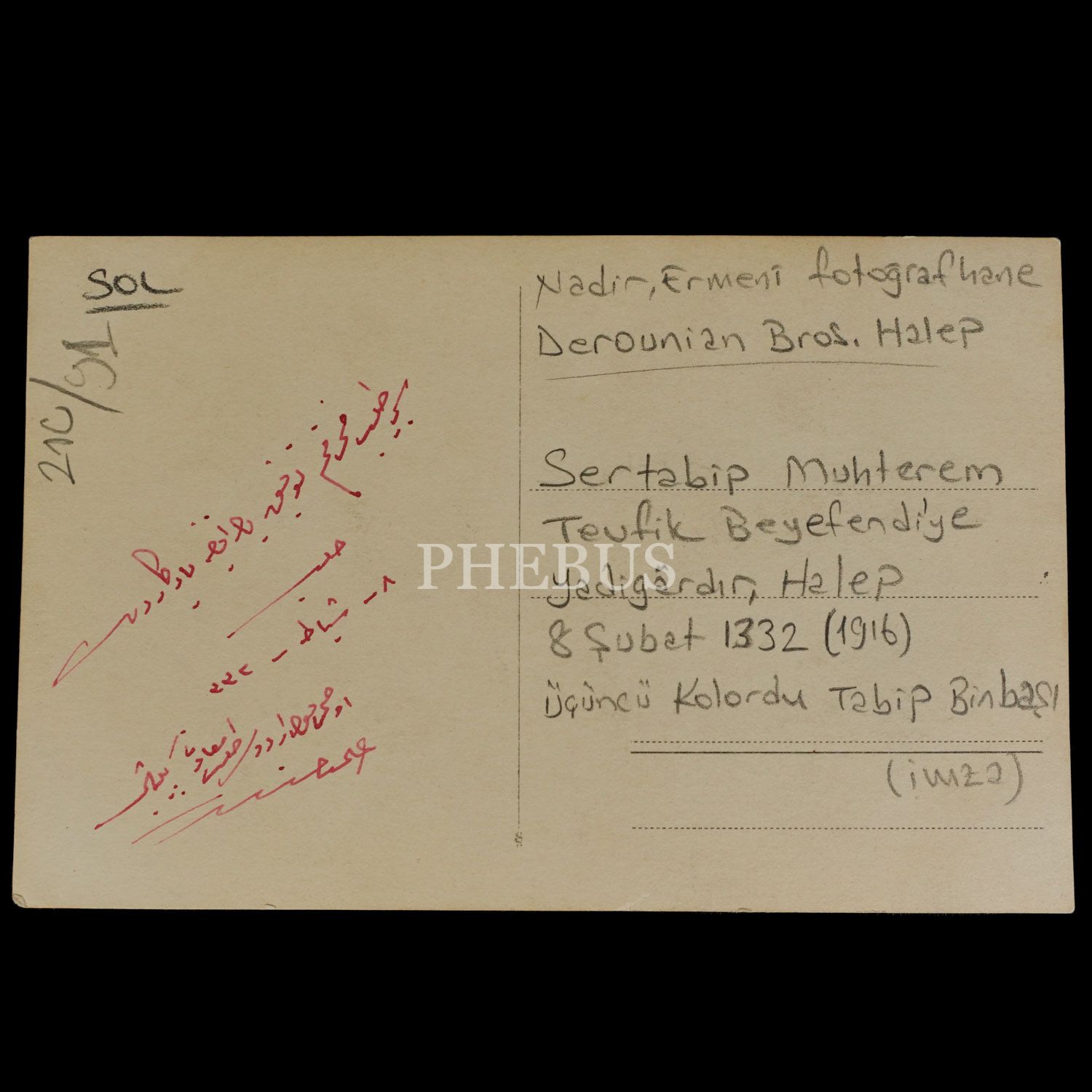 Fotoğrafın arka yüzünde, "Sertabip Muhterem Tevfik Beyefendi´ye yadigardır. (Halep) 8 Şubat 1332" notu düşülmüştür.