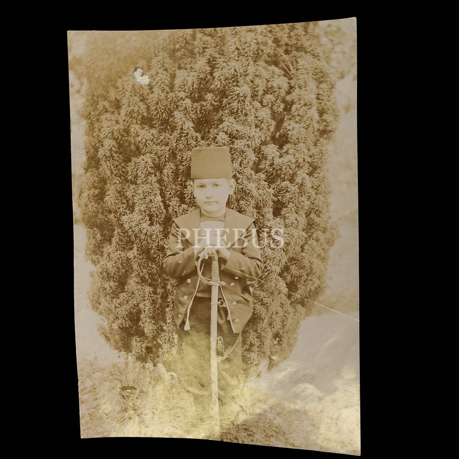 Osmanlı döneminden kılıçla poz veren denizci kostümlü bir çocuğun sepya baskı portre fotoğrafı, 10x14 cm...
