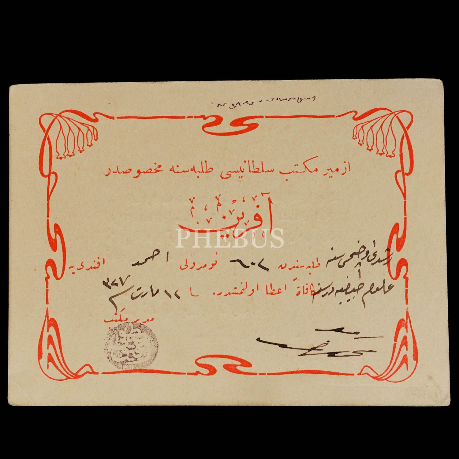 İzmir Mekteb-i Sultani talebelerinden Ahmet Efendi´ye Ulum-i Tabiyye dersinden verilen aferin varakası, 1327, 12x9 cm...