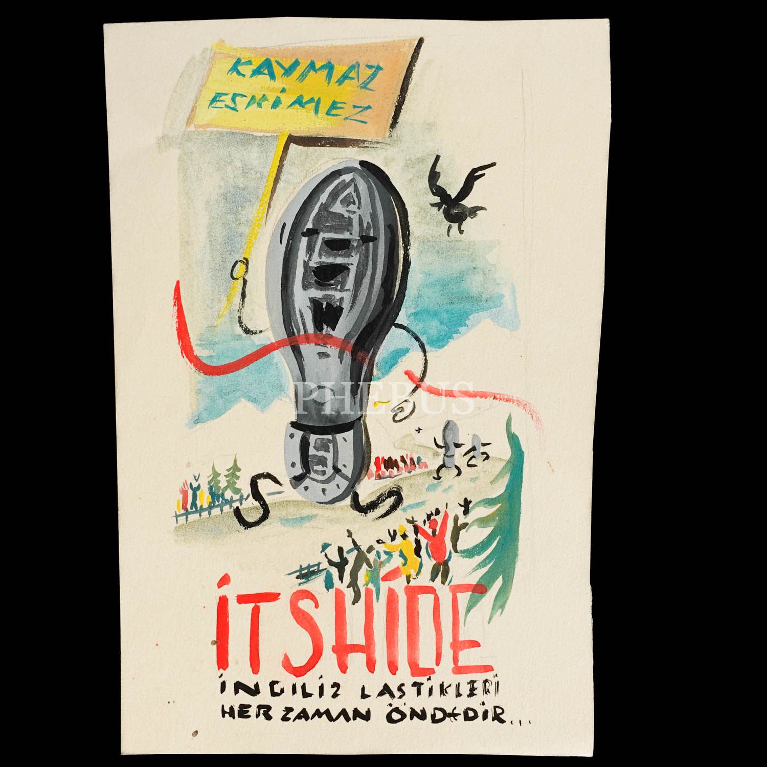 Gülümser Aral çizimi "Kaymaz / Eskimez" IT SHIDE lastiklerinin (ayakkabı) orijinal çizim reklam afişi taslağı, 11x17 cm...