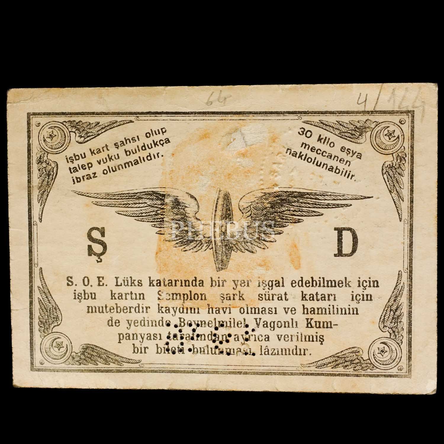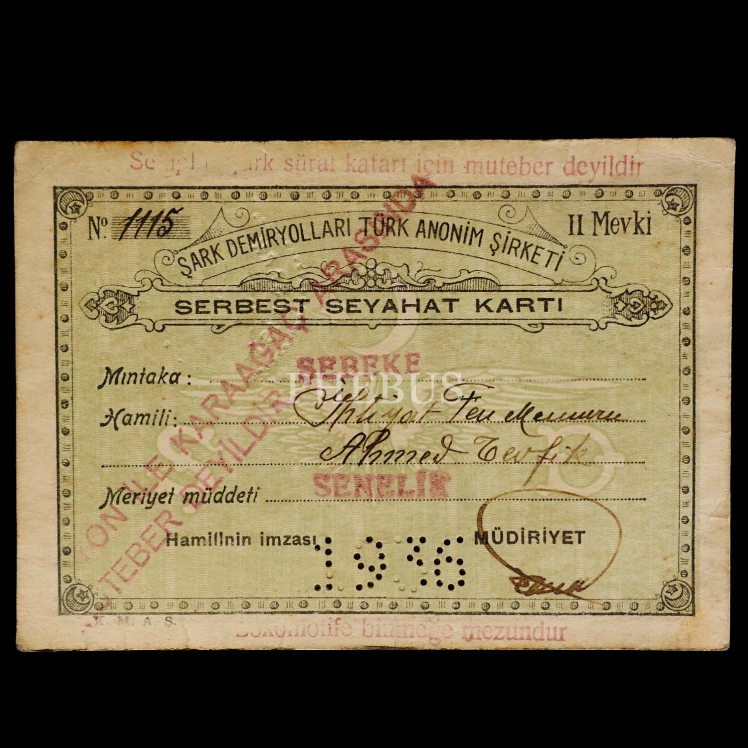 İhtiyat Fen Memuru Ahmed Tevfik adına düzenlenmiş Şark Demiryolları Türk Anonim Şirketi Serbest Seyahat Kartı (II Mevki), 12x9 cm...