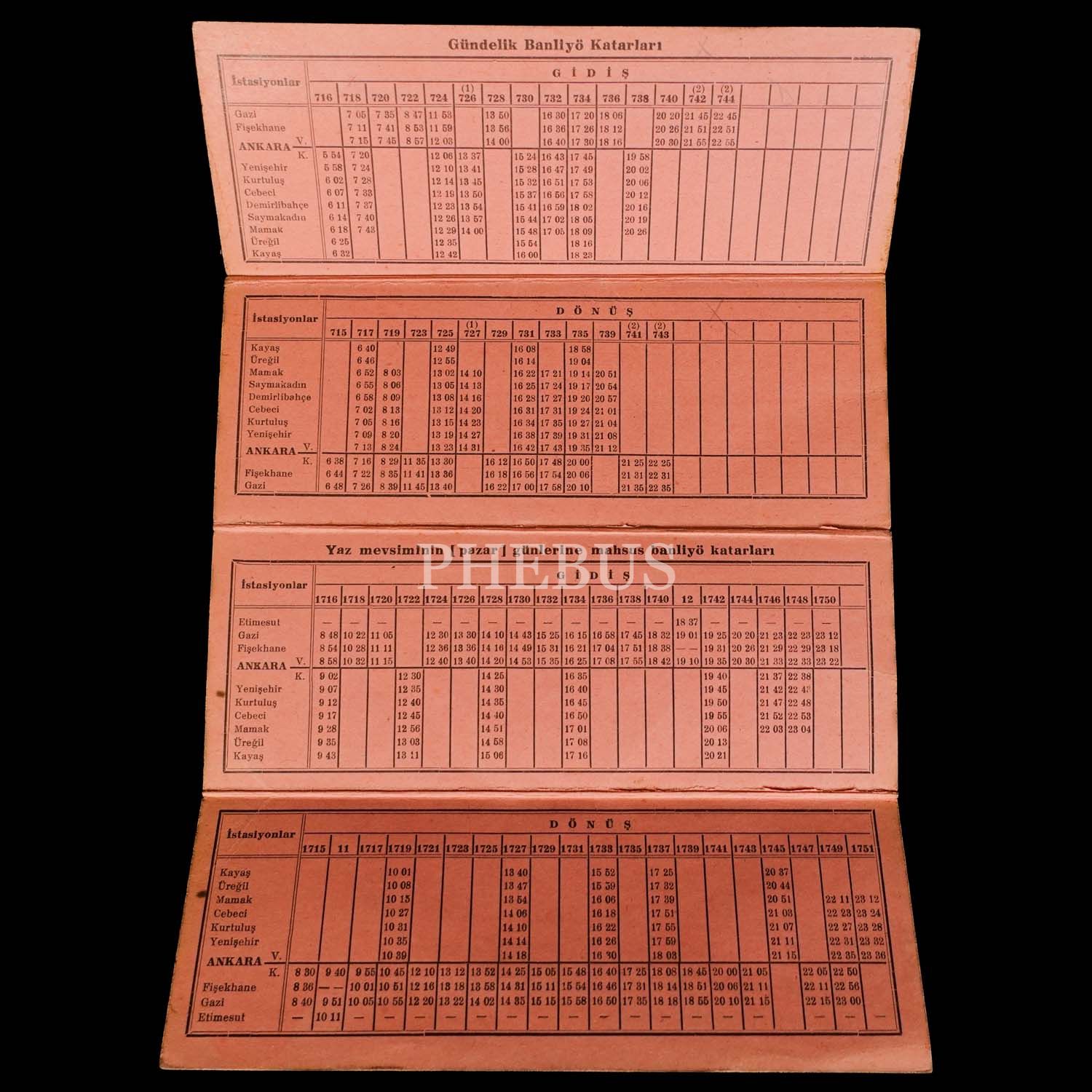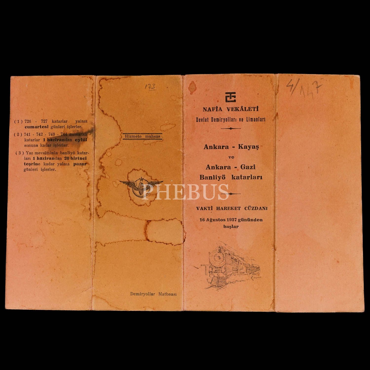 ANKARA-KAYAŞ VE ANKARA-GAZİ BANLİYÖ KATARLARI VAKTİ HAREKET CÜZDANI (16 Ağustos 1937 gününden başlar), T.C. Nafia Vekâleti Devlet Demiryolları ve Limanları, Demiryollar Matbaası, (açık halde) 16x24 cm...