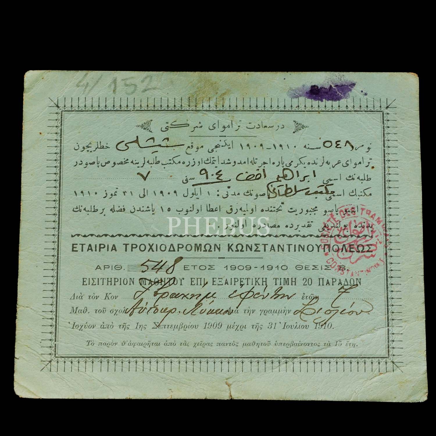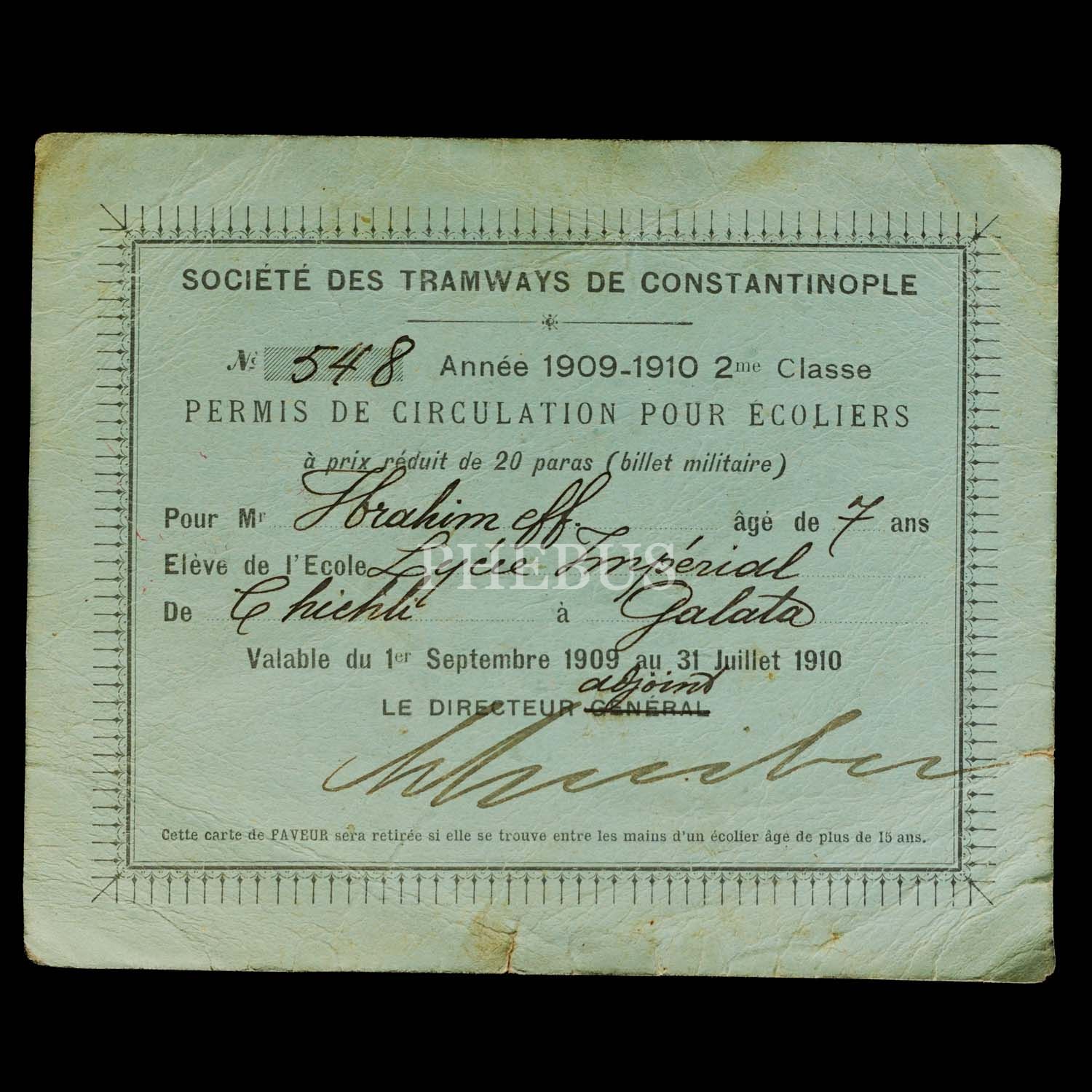 Dersadet Tramvay Şirketi´nin Mekteb-i Sultani öğrencisi İbrahim Efendi adına düzenlediği, Osmanlıca, Fransızca ve Rumca paso, 14x11 cm...