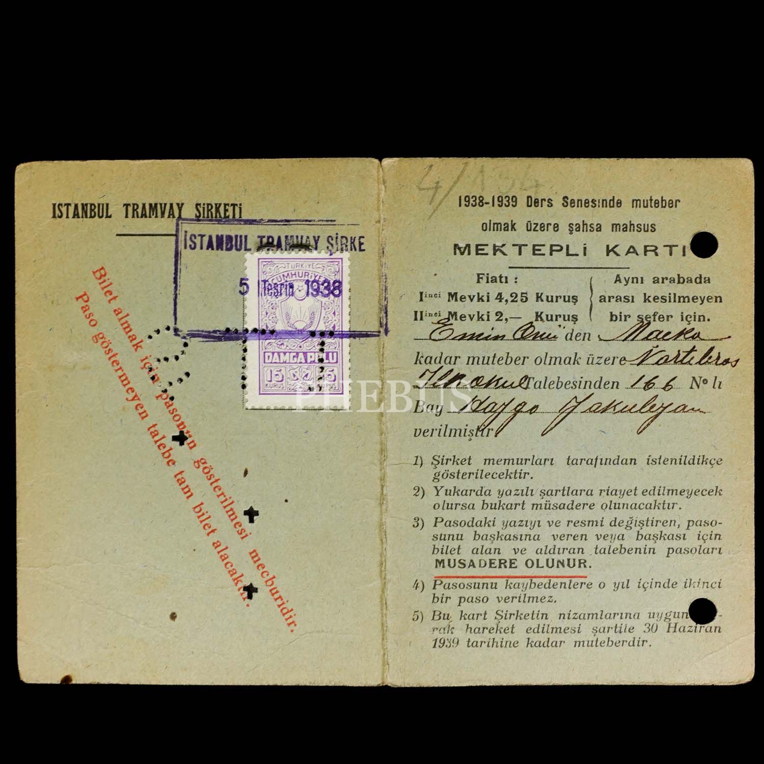 Bir ilkokul öğrencisi adına düzenlenmiş İstanbul Tramvay Şirketi Mektepli Kartı, 1938-1939, fotoğraflı, 8x12 cm...
