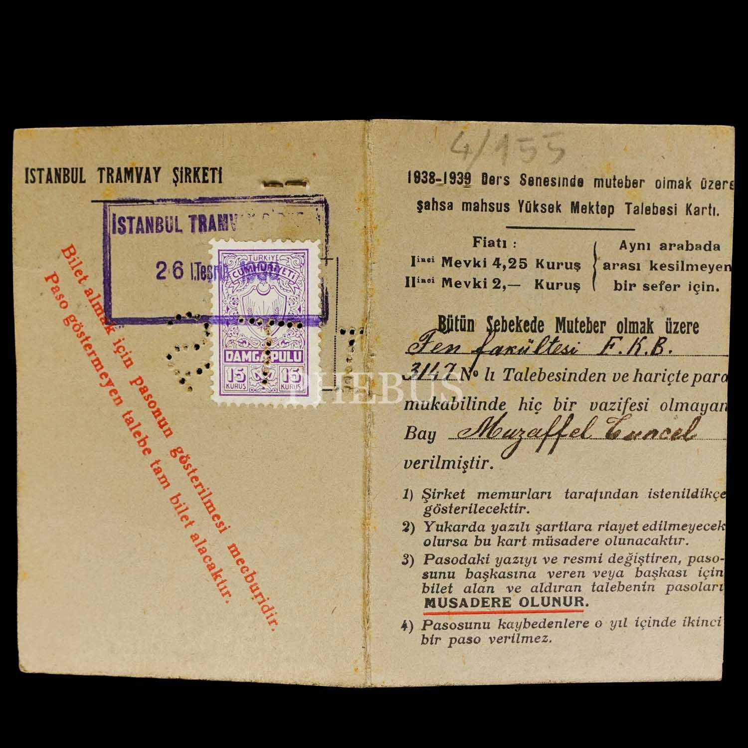 Fen Fakültesi öğrencisi Muzaffer Tuncel adına düzenlenmiş İstanbul Tramvay Şirketi Yüksek Mektep Talebesi Kartı, 1938-1939, fotoğraflı, 8x12 cm...