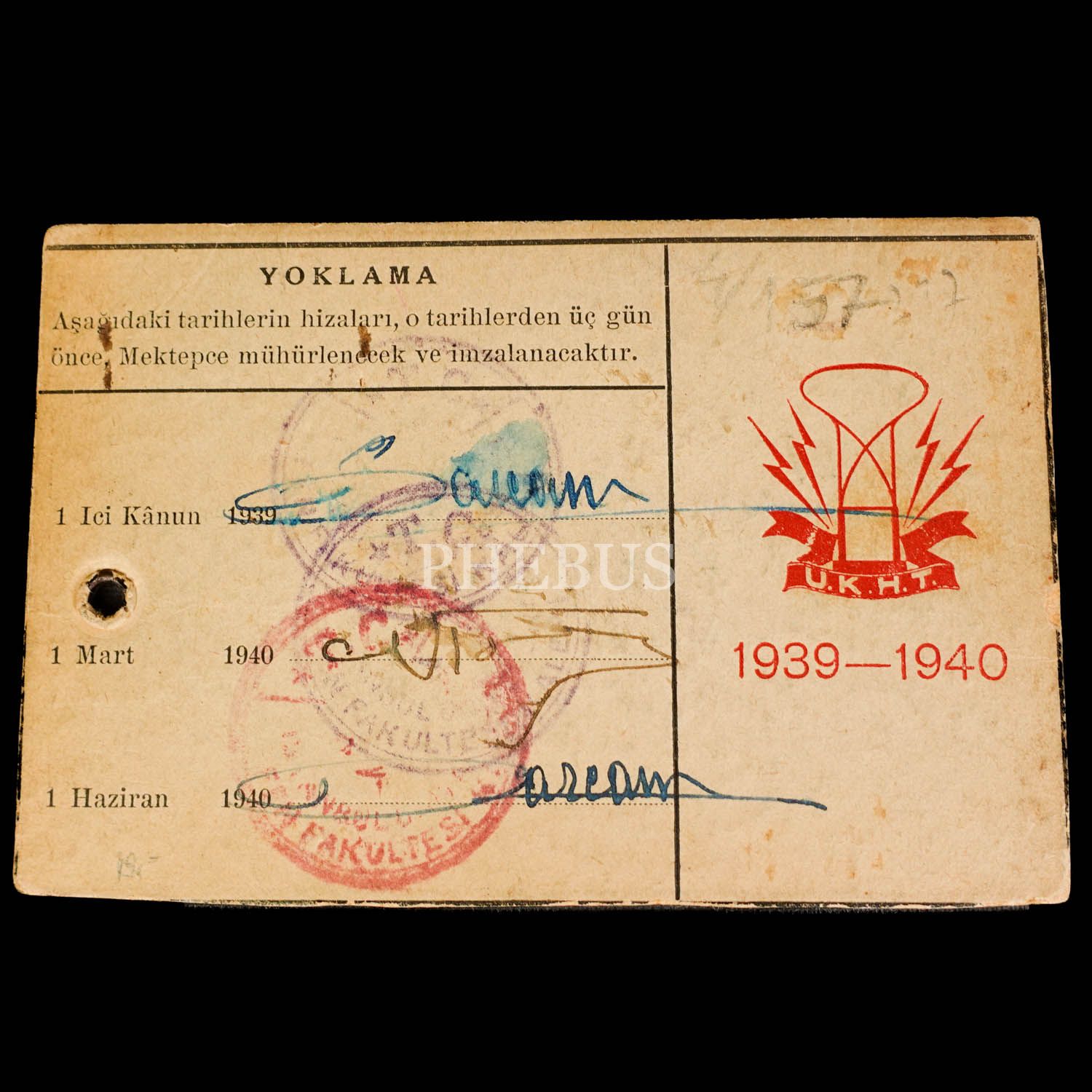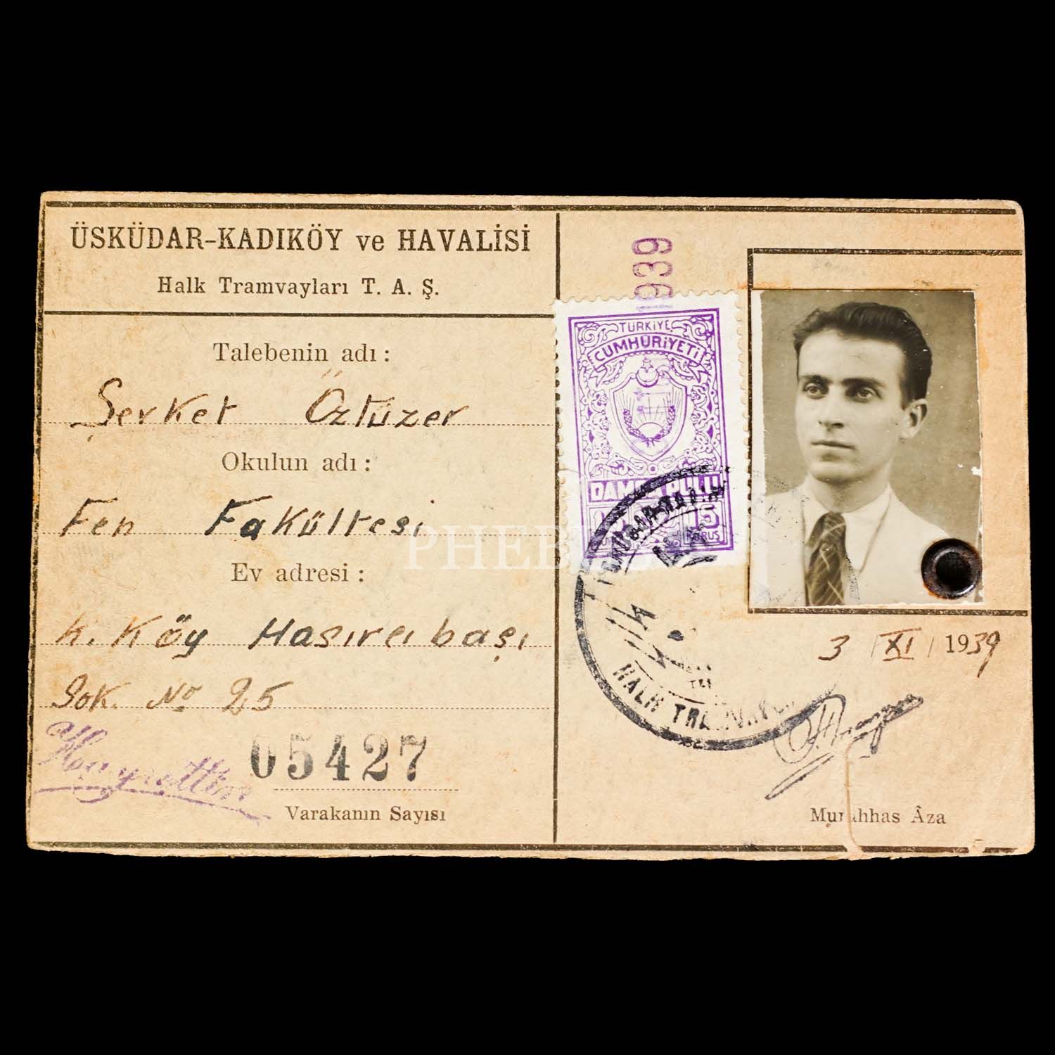 Fen Fakültesi öğrencisi Şevket Öztüzer adına düzenlenmiş Üsküdar-Kadıköy ve Havalisi Halk Tramvayları T.A.Ş. ulaşım kartı, 1939-1940, fotoğraflı, 13x8 cm...