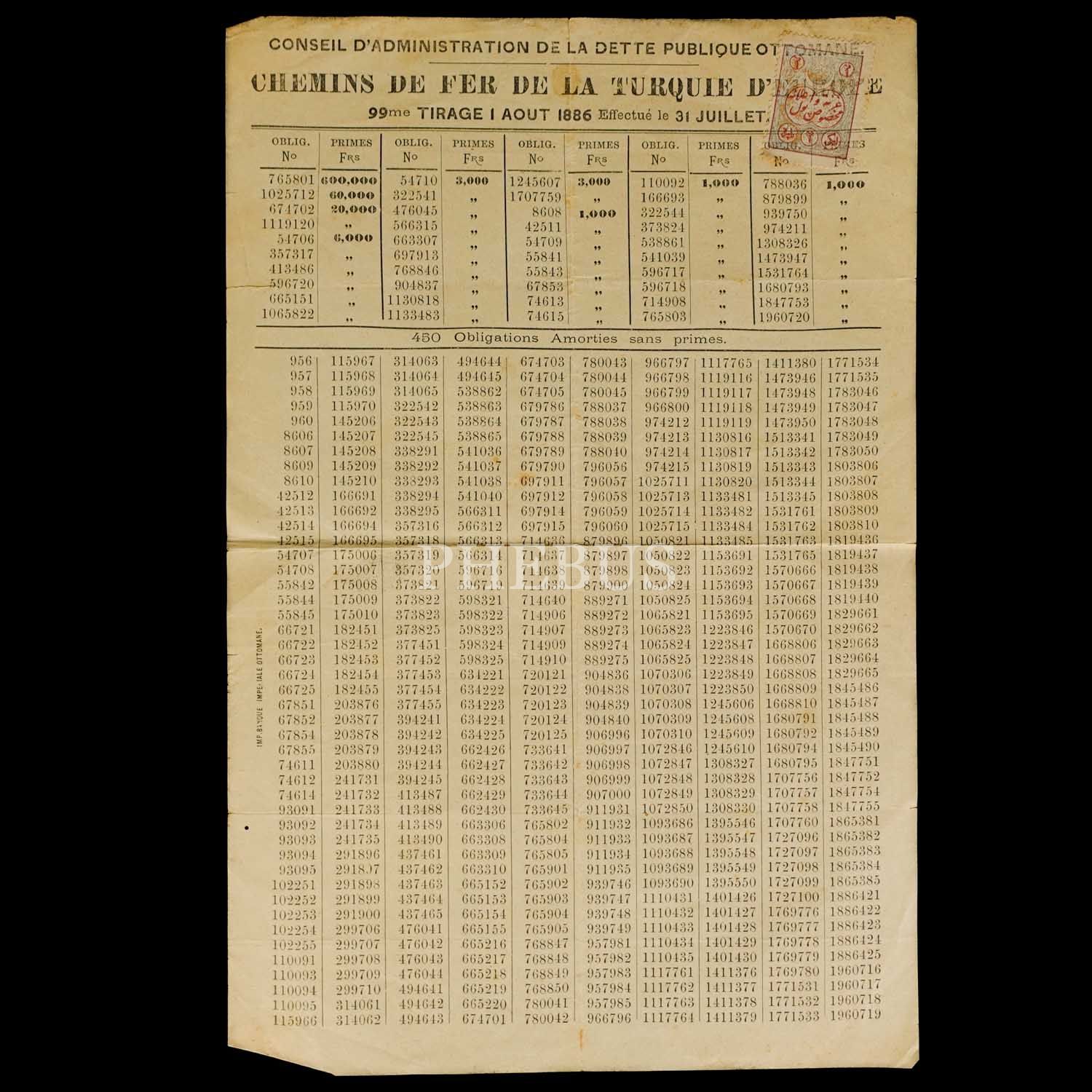 Düyun-u Umumiye Türkiye Avrupa Demiryolları tahvil senetleri (2 adet), 1886, 20x30 cm...