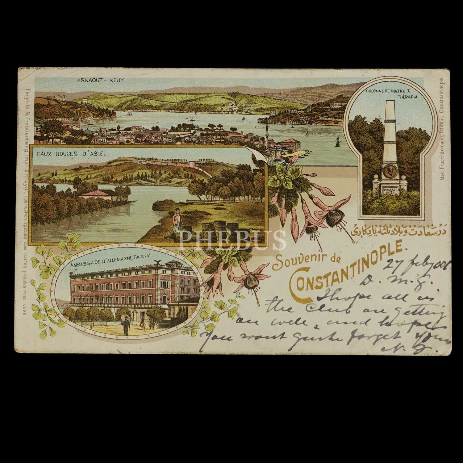 Arnavutköy, Tarabya Moltke Anıtı, Göksu Deresi ve Almanya Sefareti görselli parçalı kartpostal, "Souvenir de Constantinople", ed. Max Fruchtermann, Constantinople, 14x9 cm...