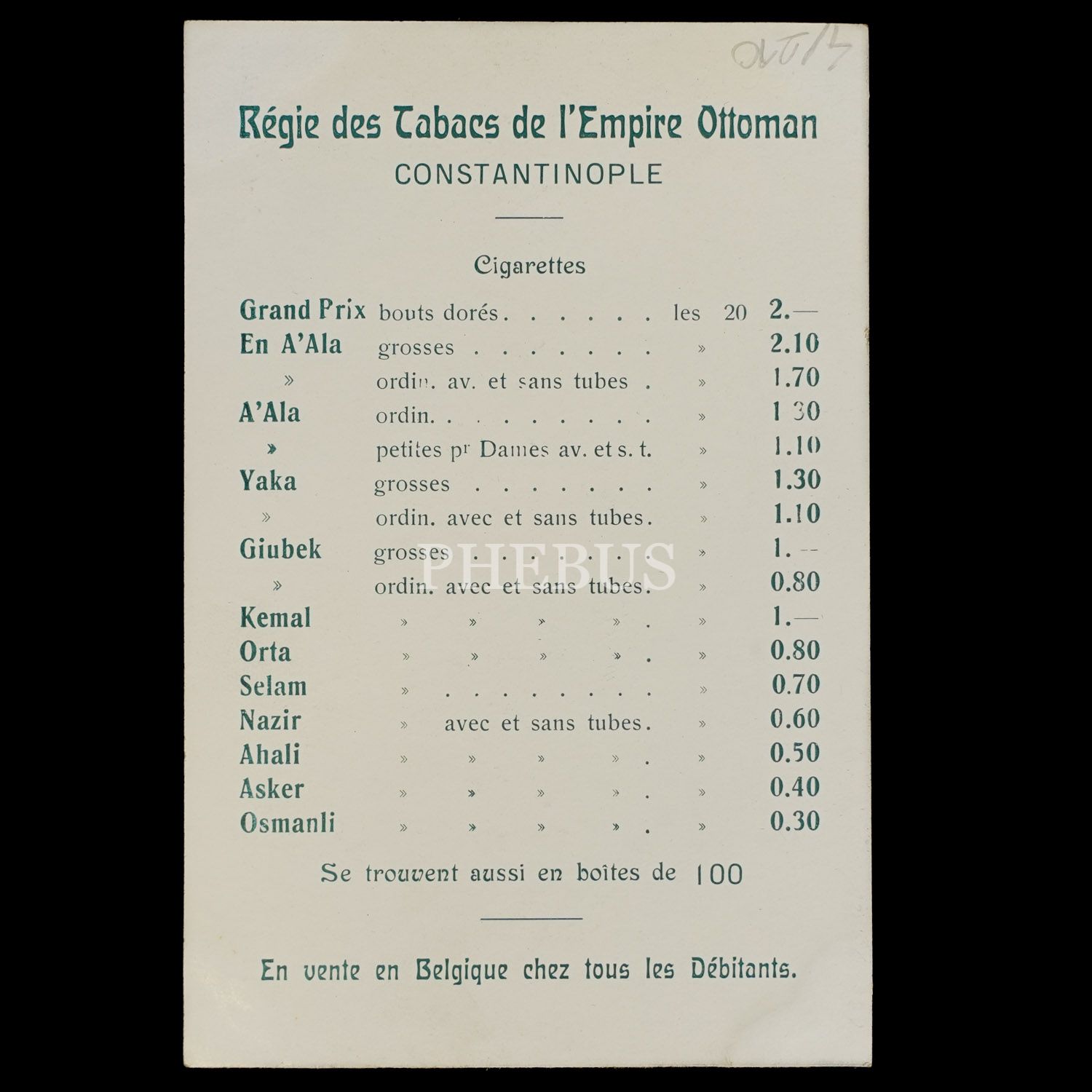 Arka yüzünde "Regie des Tabacs de l´Empire Ottoman (Constantinople)" başlığıyla Regie bünyesindeki sigaraların isimleri, özellikleri ve fiyatları yer almaktadır.