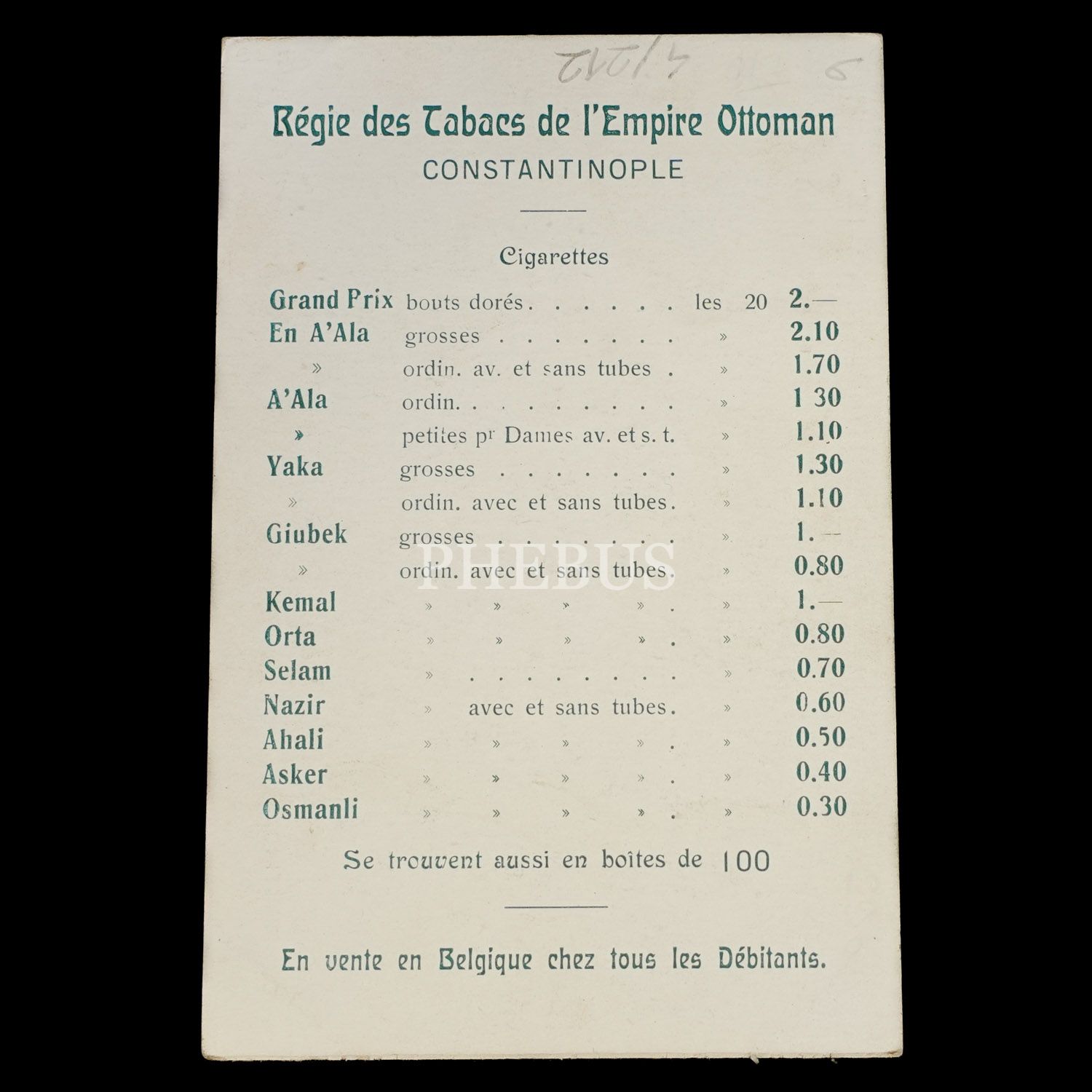 Arka yüzünde "Regie des Tabacs de l´Empire Ottoman (Constantinople)" başlığıyla Regie bünyesindeki sigaraların isimleri, özellikleri ve fiyatları yer almaktadır.