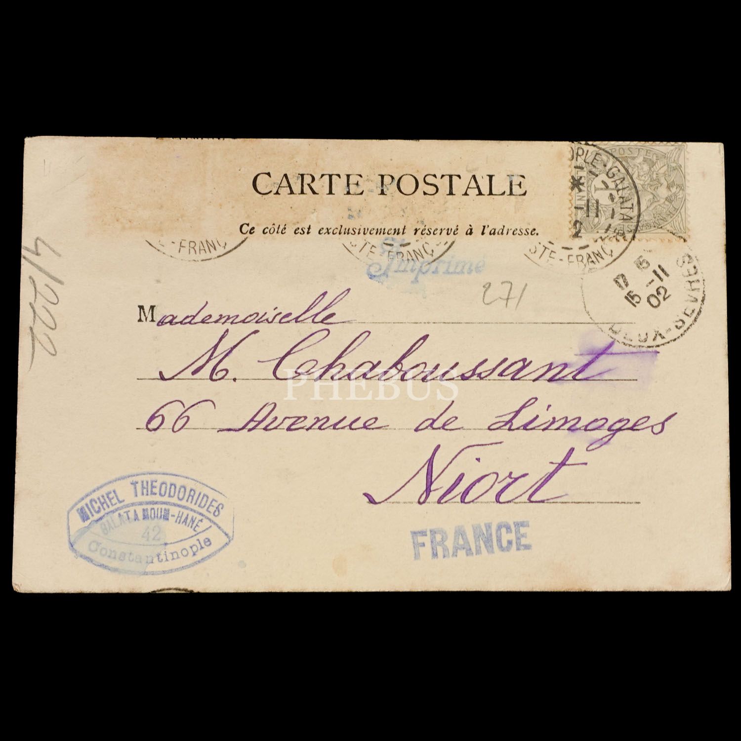 Arka yüzü "Michel Theodorides - Galata Moum-Hane, Constantinople" kaşeli. Postadan geçmiş.