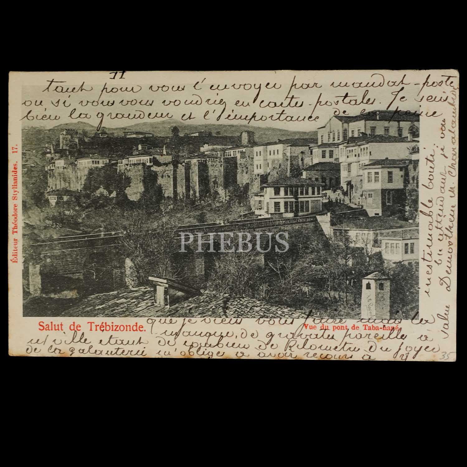 Trabzon Tabakhane Köprüsü, "Salut de Trebizonde - Vue du pont de Taba-hane", ed. Theodore Stylianides, 14x9 cm...