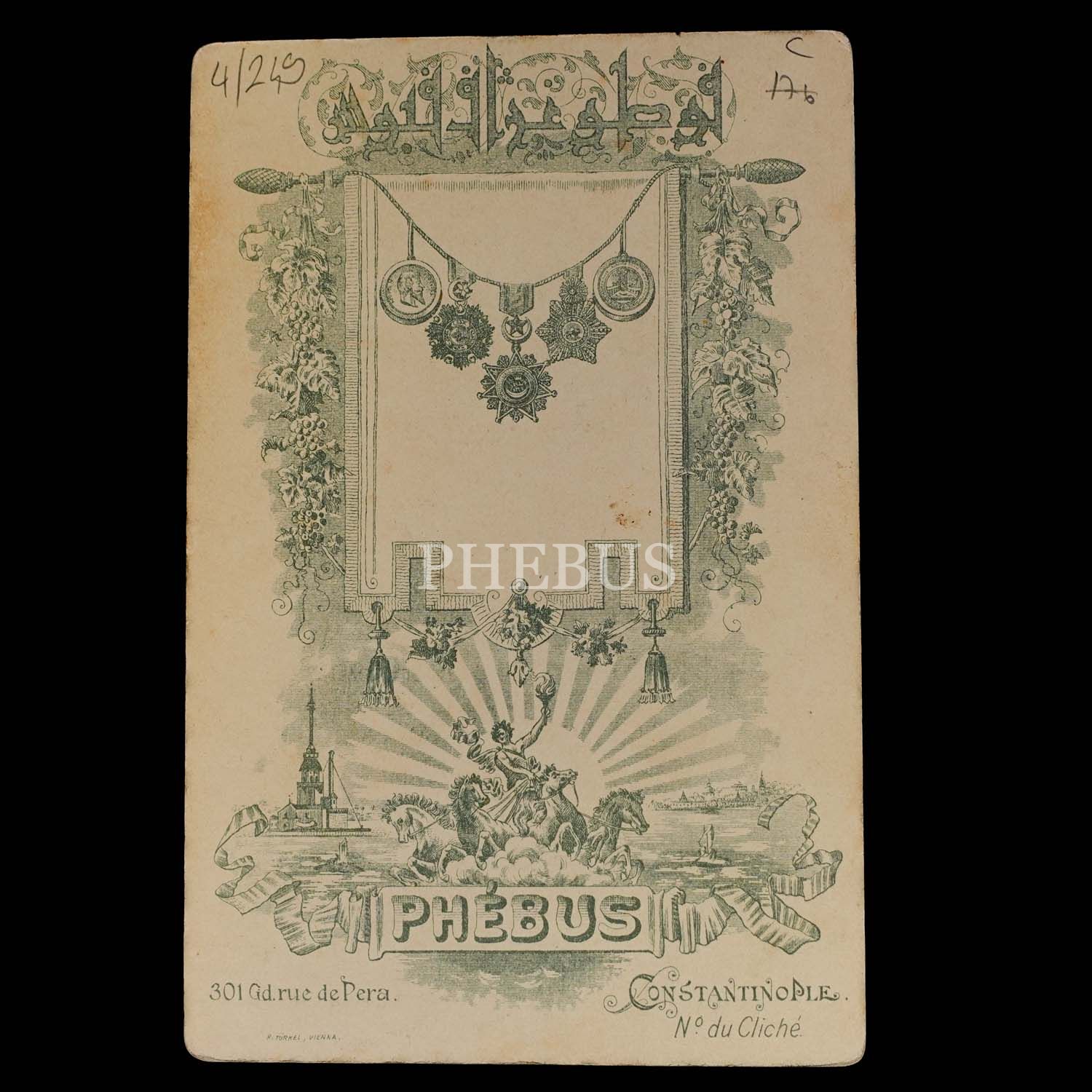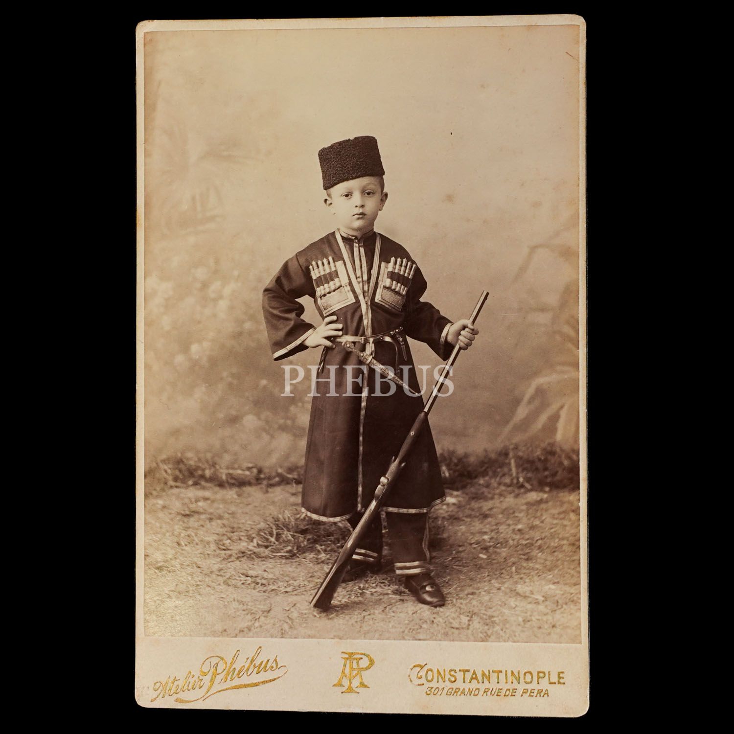 Elinde tüfekle poz veren geleneksel Kafkas kıyafetli bir çocuğun kabin fotoğrafı, Phebus, Constantinople, 11x17 cm...