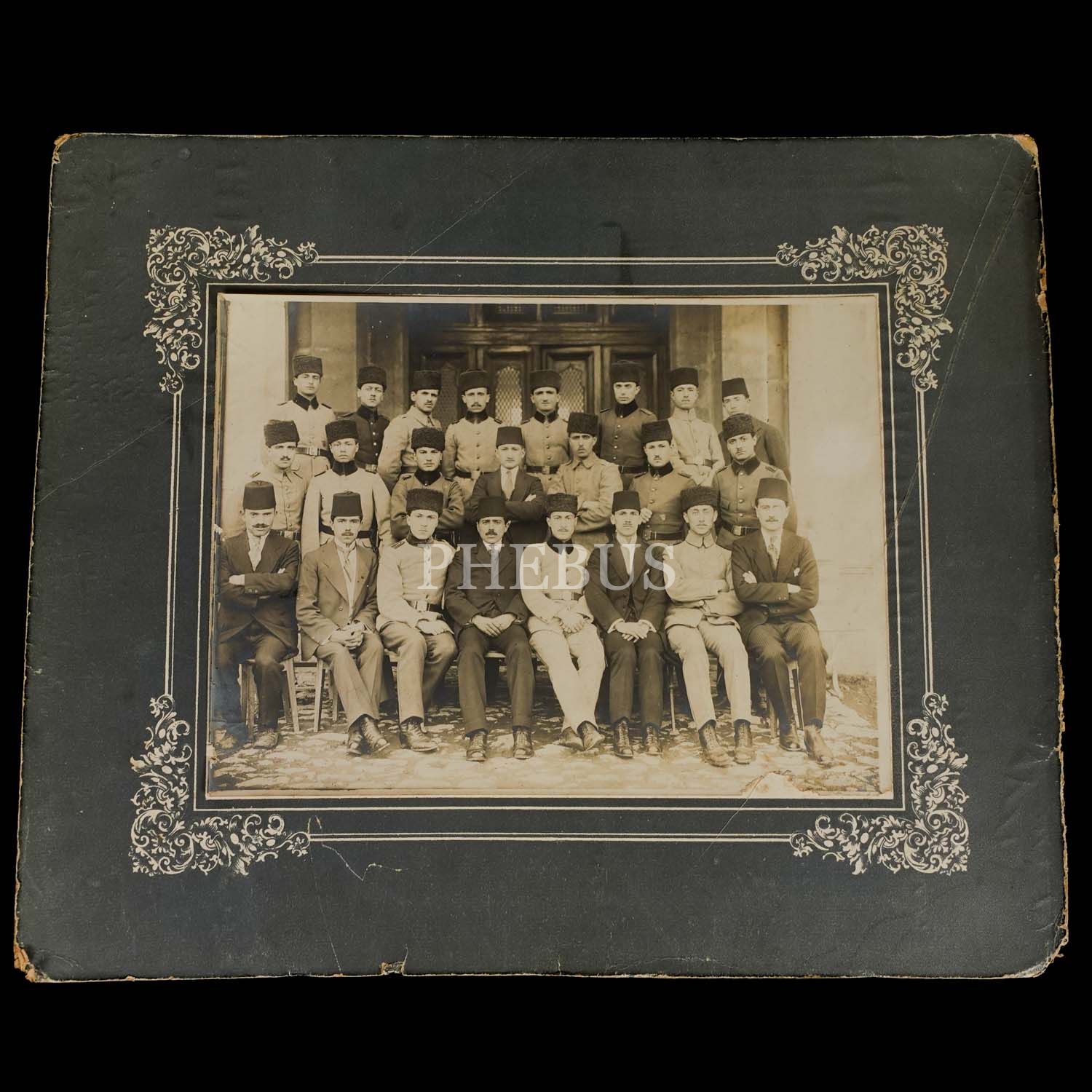 Cihan Harbi yıllarından sivil ve askeri erkandan oluşan bir topluluğun hatıra fotoğrafı, fotoğraf 24x18 cm, paspartu 36x30 cm...