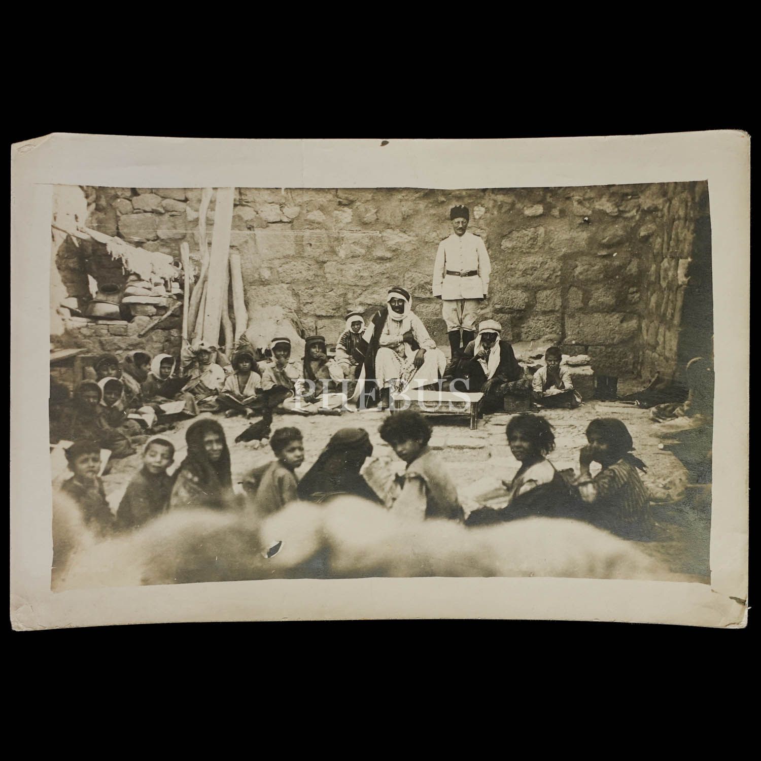 Bir Osmanlı subayının gözetimi altında eğitim veren Arap öğretmenler ve öğrencileri, 15x10 cm...