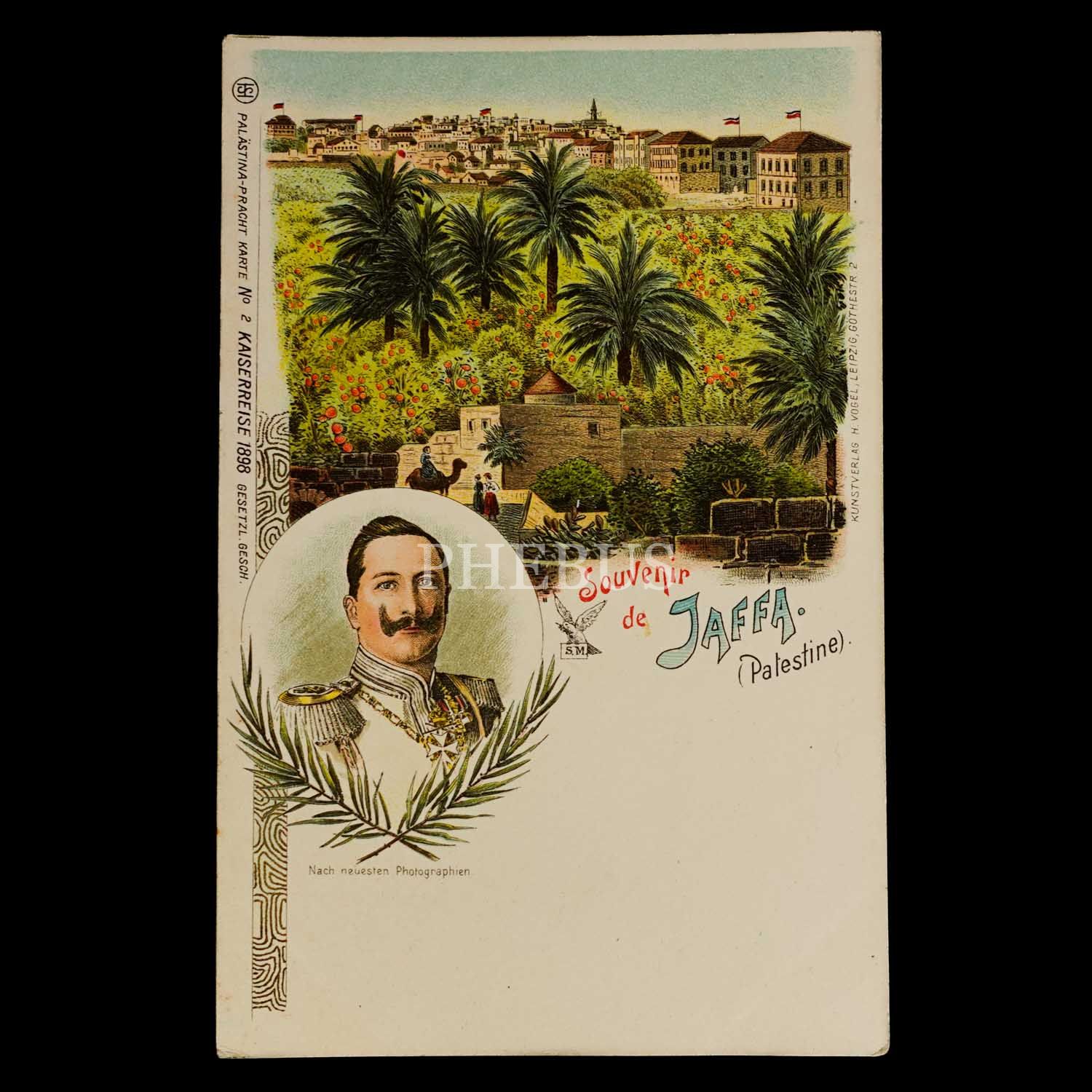 Kayzer Wilhelm´in 1898 yılında ziyaretine şerefine basılmış, Wilhelm ve Yafa şehri görselli parçalı kartpostal, "Souvenir de Jaffa (Palestine)", ed. Kunstverlag H. Vogel, Leipzig, 9x14 cm...