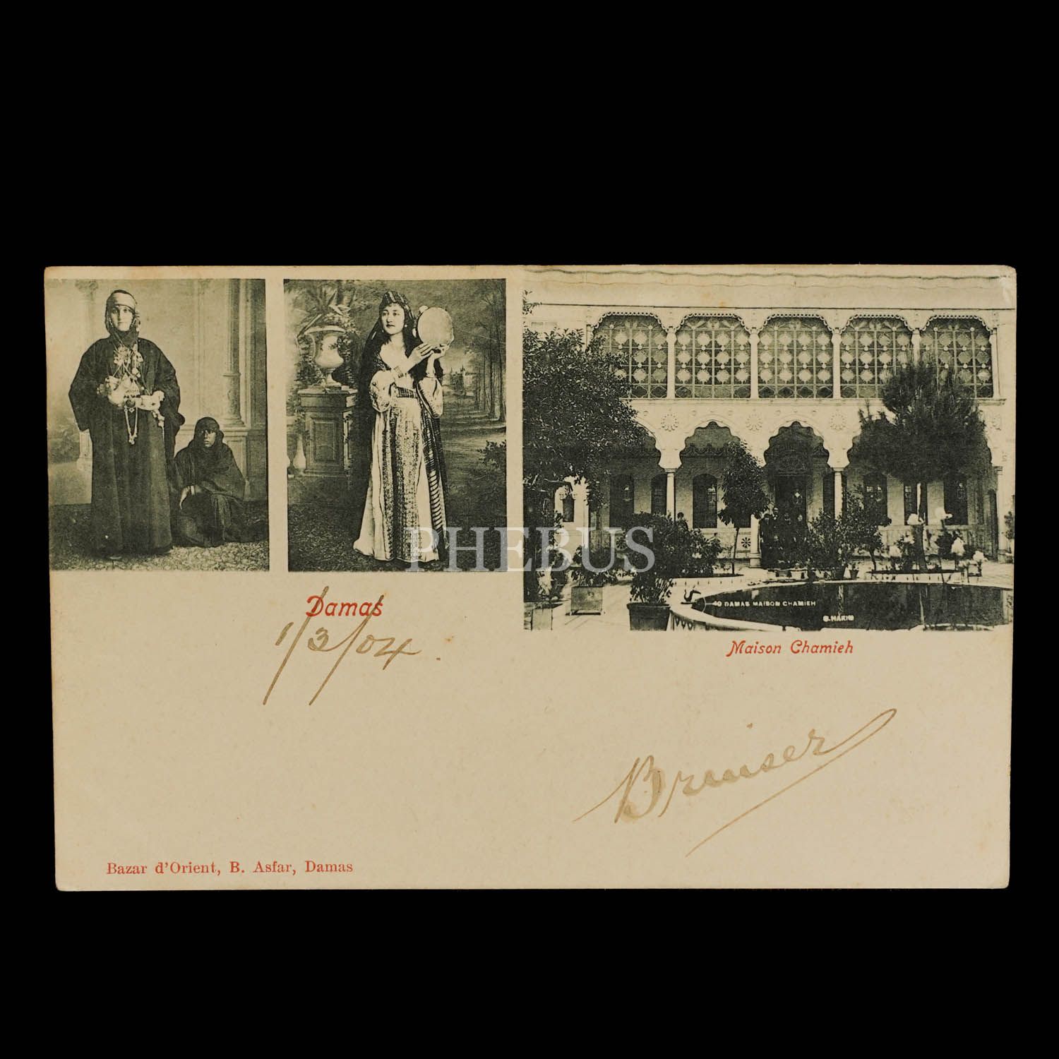Şamlı kadınlar ve ´Chamieh´ Evi görselli parçalı kartpostal, "Damas", ed. Bazar d´Orient, B. Asfar, Damas, 14x9 cm...