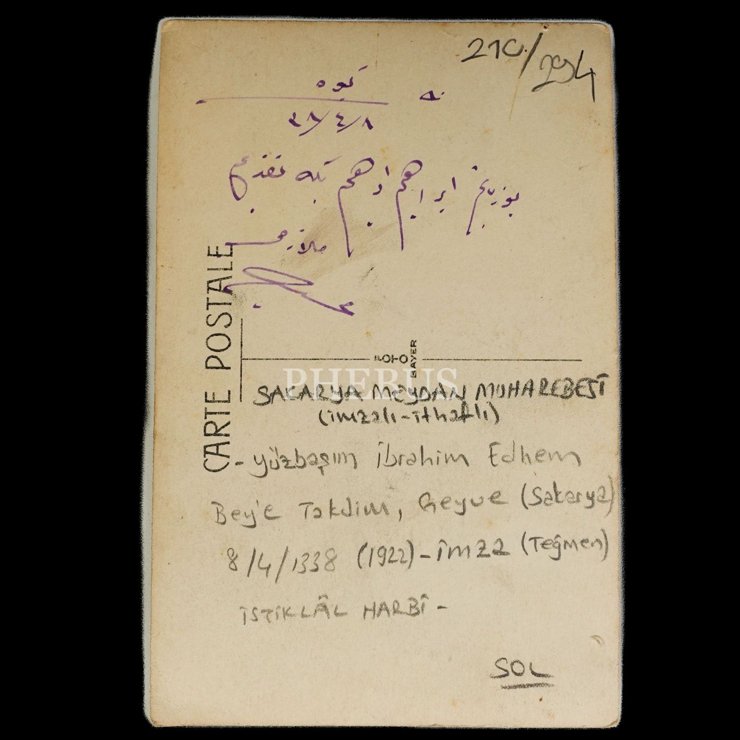 Arka yüzünde, "Yüzbaşım İbrahim Ethem Bey´e takdim. (Geyve, Sakarya) - 8 Nisan 1338" ithafı yer almaktadır.