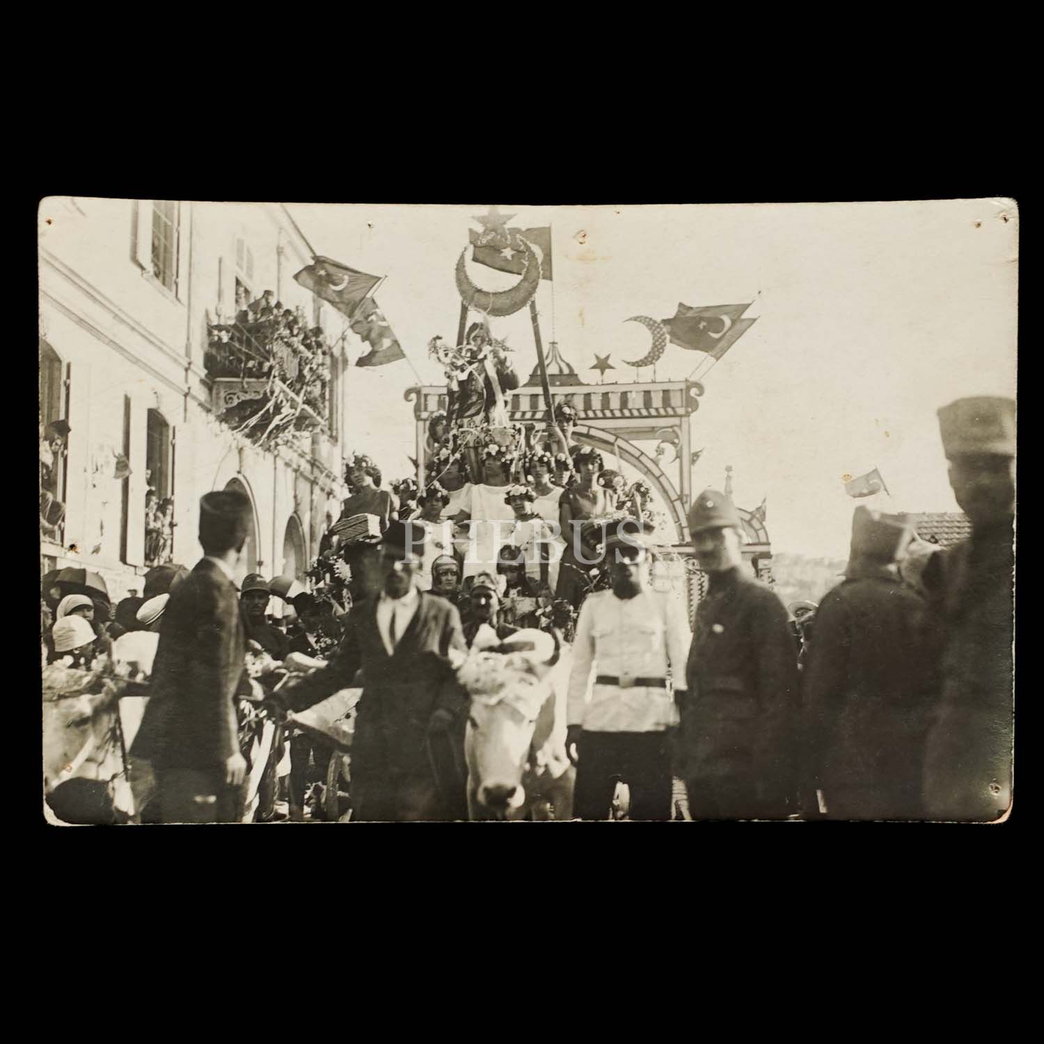 Bir milli bayram vesilesiyle süslenmiş ve bayraklarla donatılmış araba, askerlerin refakatinde tören alanına doğru intikal ederken, 14x9 cm...