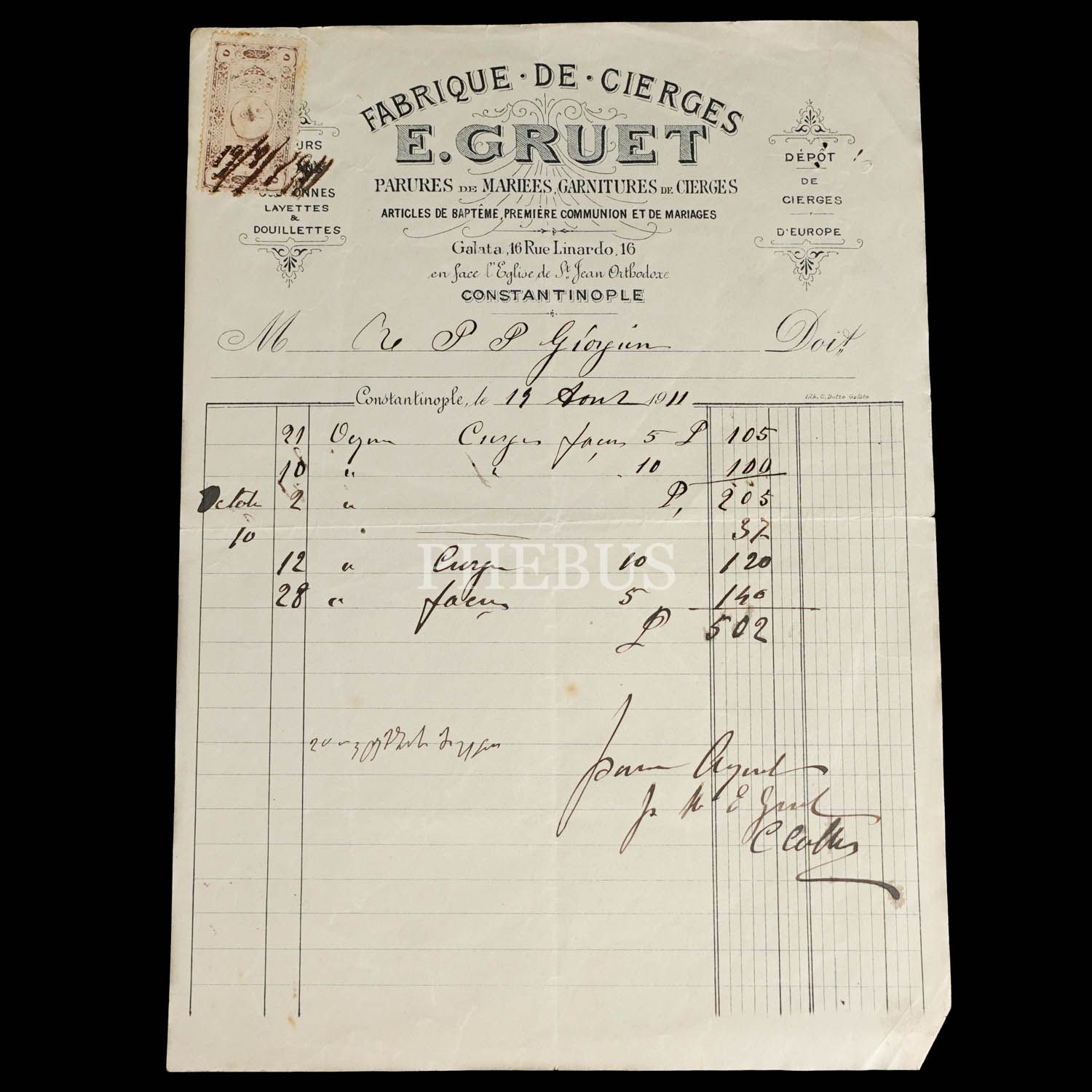 Mum Fabrikası E. Gruet antetli fatura, "Fabrique de Cierges E. Gruet - Constantinople", 1911, 21x29 cm...