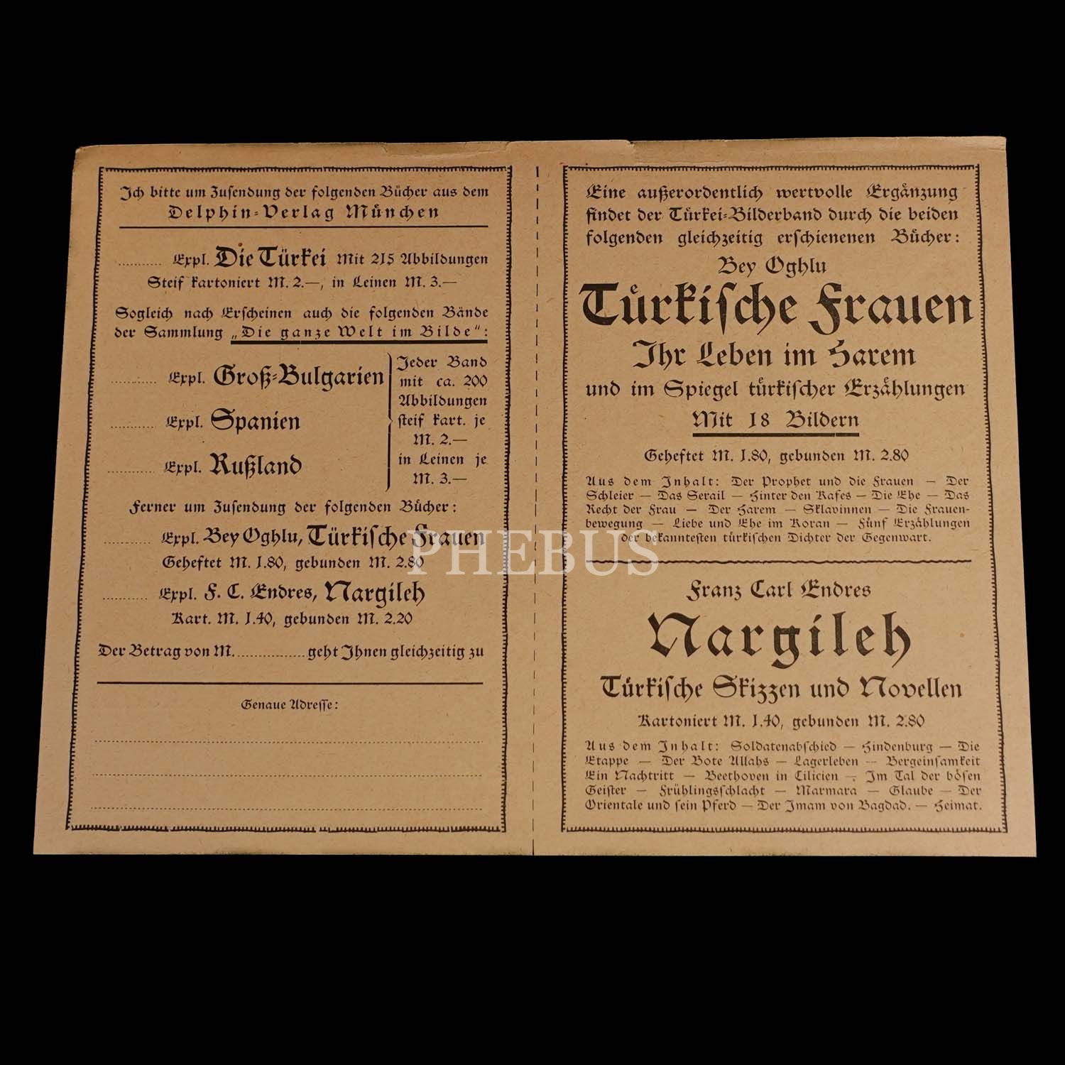 Türkiye ile alakalı kaleme alınmış Almanca kitapların kısa tanıtımlarını içeren kitap sipariş kartı (doldurulmamış), 18x14 cm...