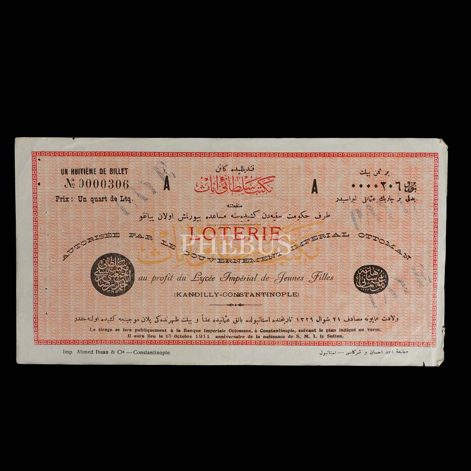 Kandilli Mekteb-i Sultani-i İnas menfaatine düzenlenen piyangonun bileti, 21x11 cm...