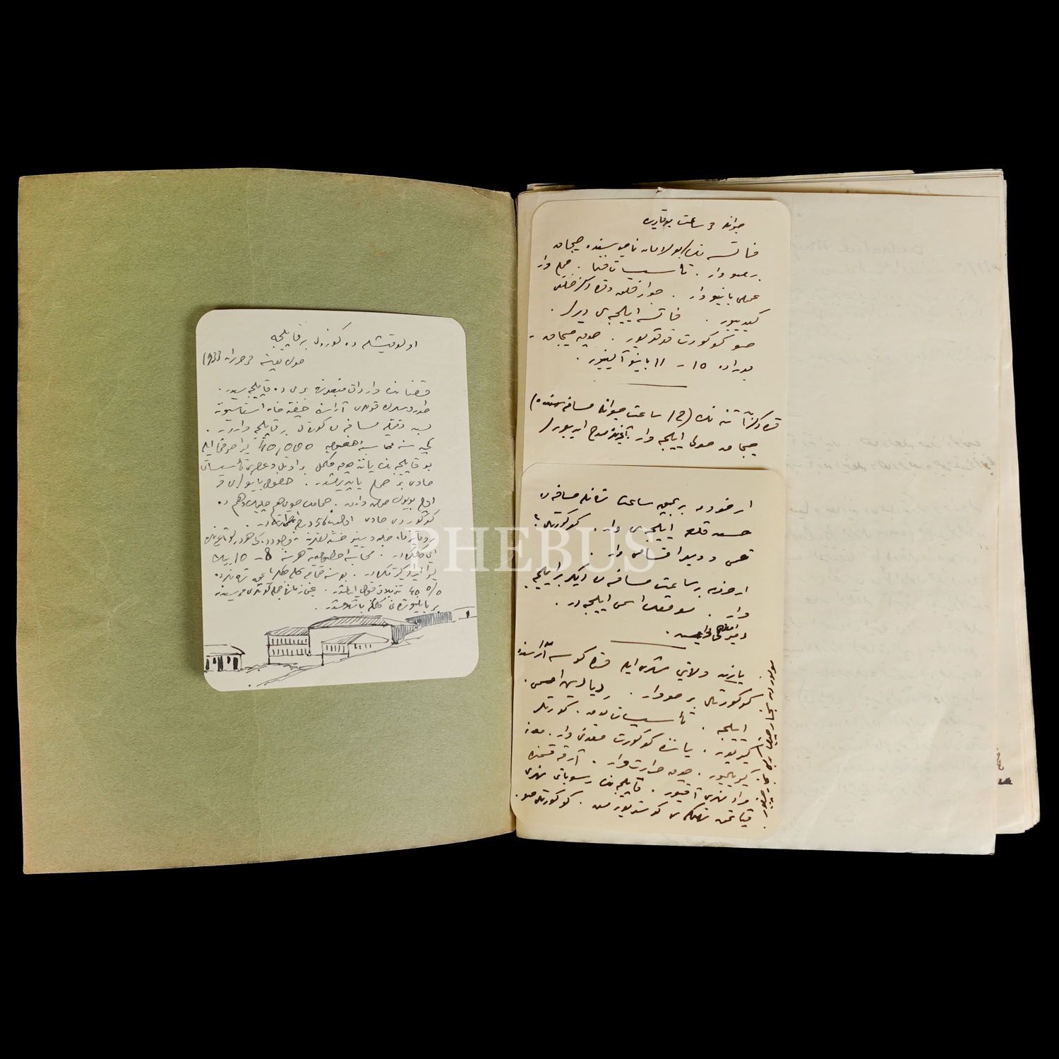 Anadolu´da bulunan maden suları, ılıcalar ve kaplıcalar hakkında kaleme alınmış, içine "Dr. Akil Muhtar (Özden)" antetli kağıtlar yapıştırılarak notlar alınmış defter, 15x20 cm...
