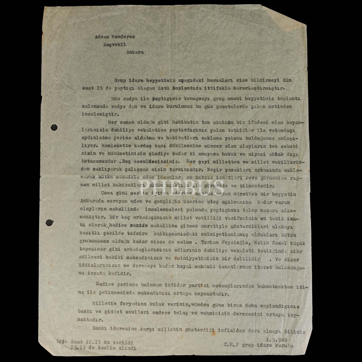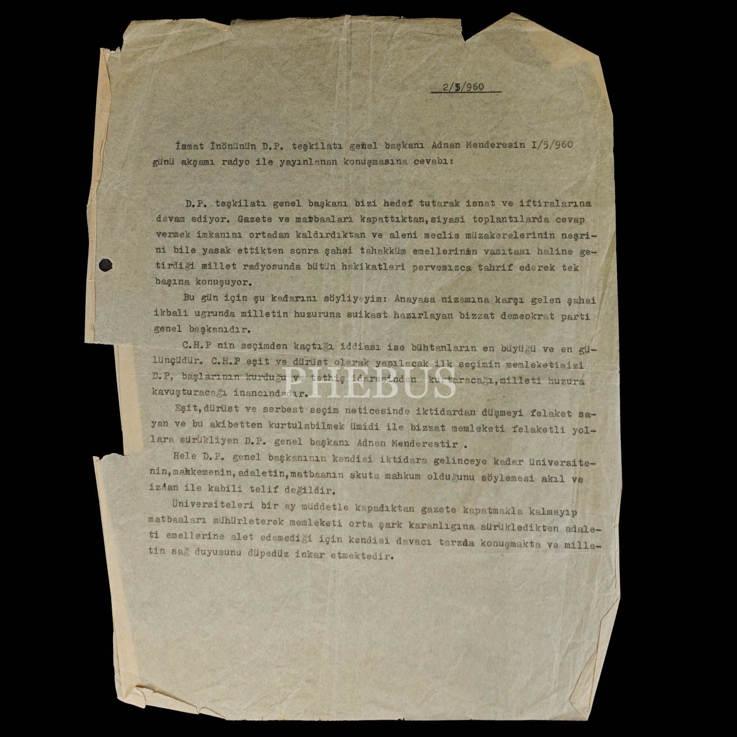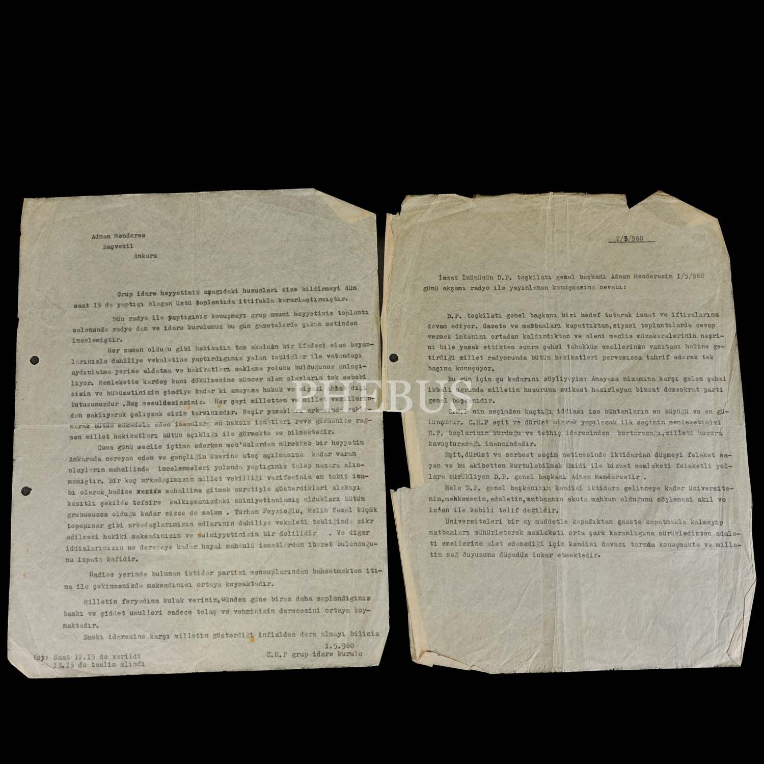 Adnan Menderes´in, 1 Mayıs 1960 tarihinde radyo ile yayınlanan konuşmasına İsmet İnönü ve CHP Grup İdare Kurulu tarafından verilen kınama içerikli cevap mektupları (2 yaprak), 21x30 cm...