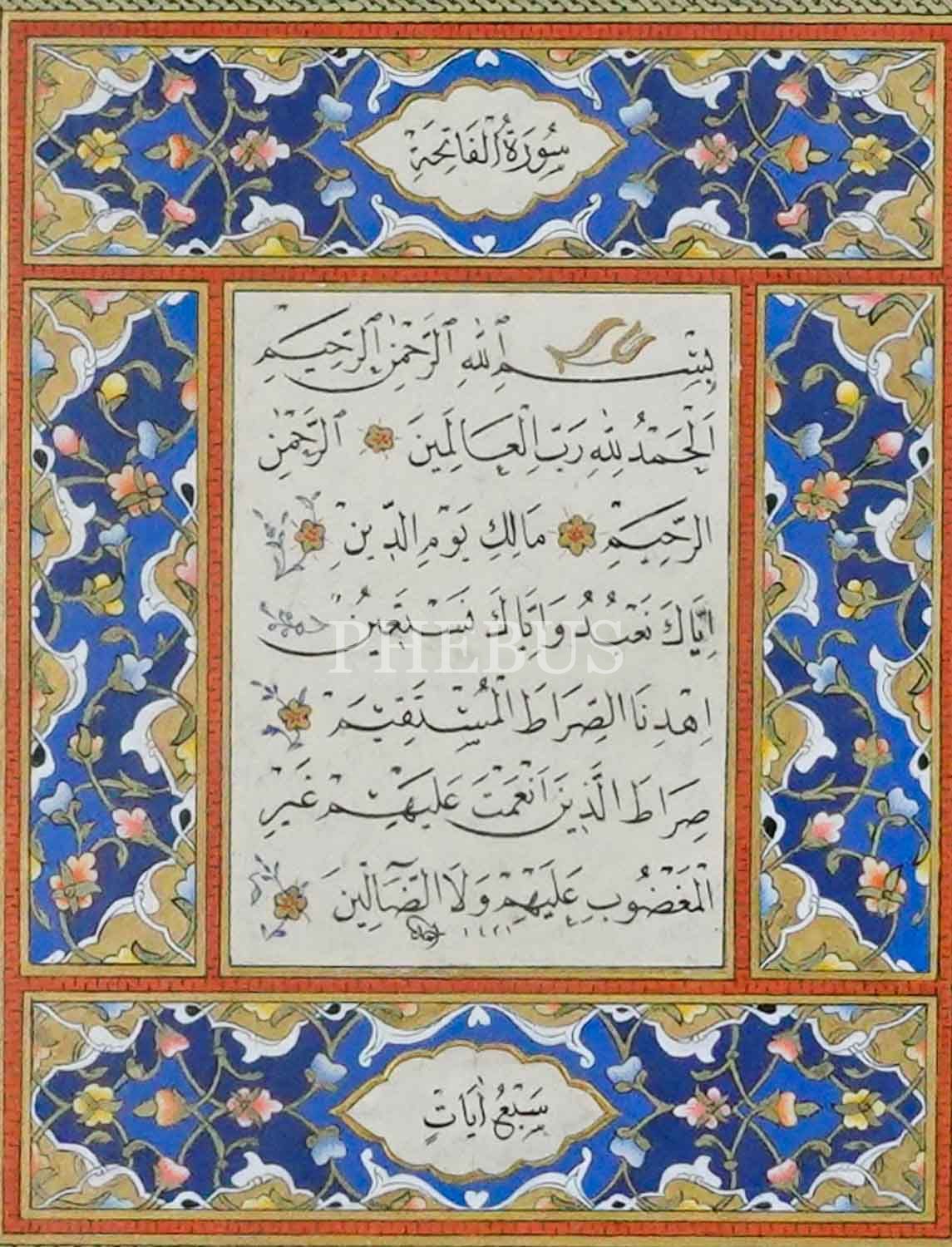 Mushaf sayfası formunda nesih Fatiha-i Şerife, Ahmet ketebeli, 1421, tezhip: Seniha (Hasoğlu), eser ölçü: 35x26 cm, çerçeve ölçü: 53x44 cm...