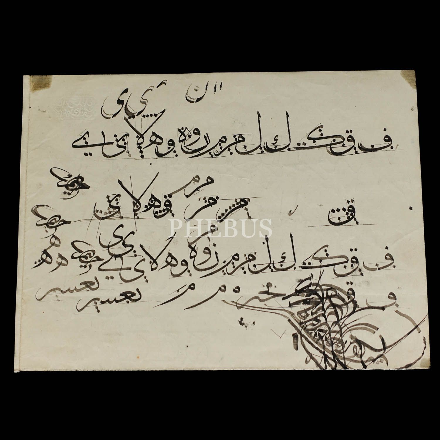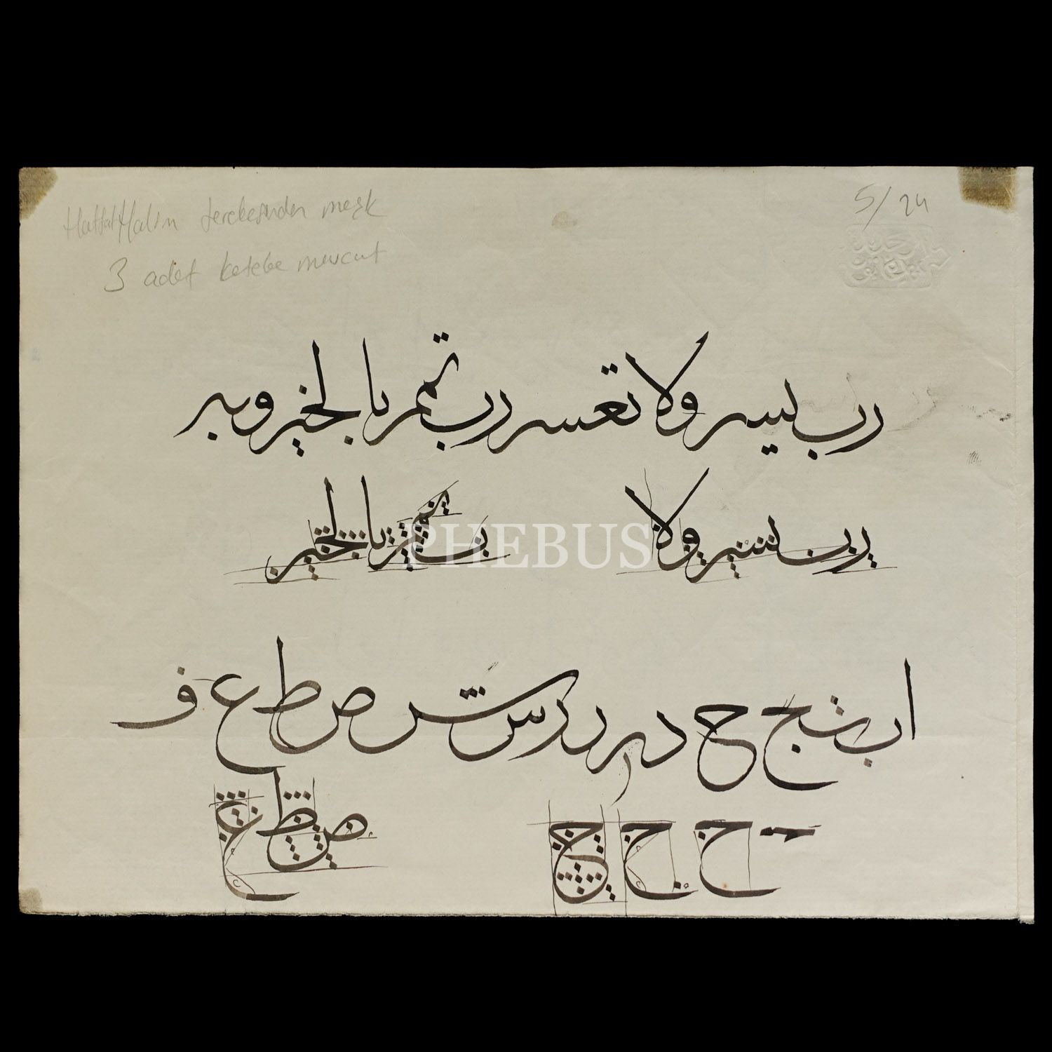 Halim Özyazıcı terekesinden, üzerinde Halim Efendi´nin üç adet imzasının bulunduğu karalama rabbiyessir duası ve sülüs müfredat, arkalı önlü, 23x17 cm...