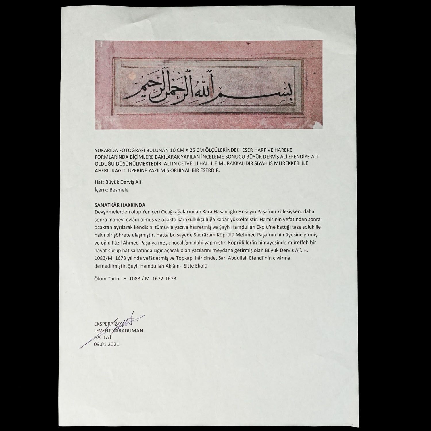 Eserin orijinalliği ve Derviş Ali Efendi'ye ait olduğuna dair 2021 yılında alınmış rapor bulunmaktadır. Görseli mevcuttur.