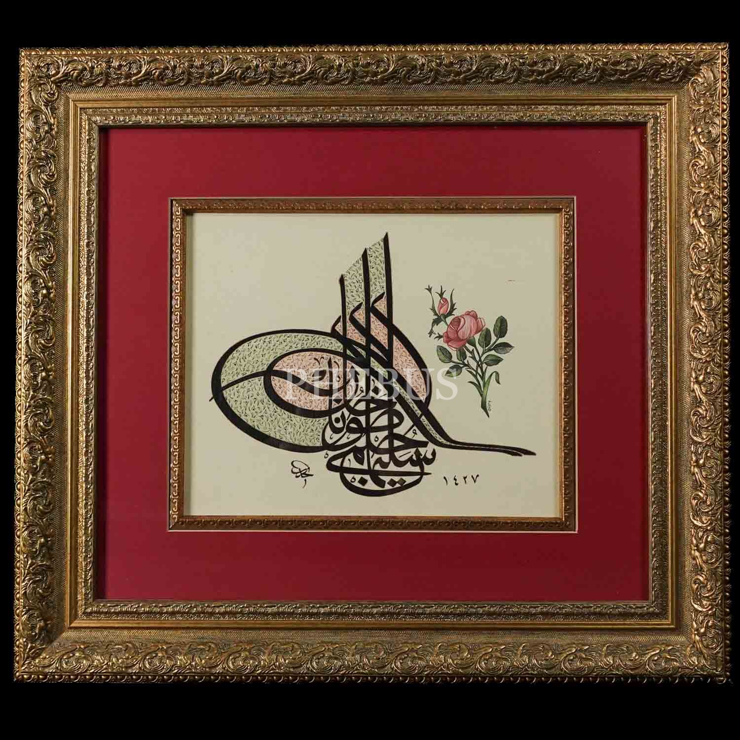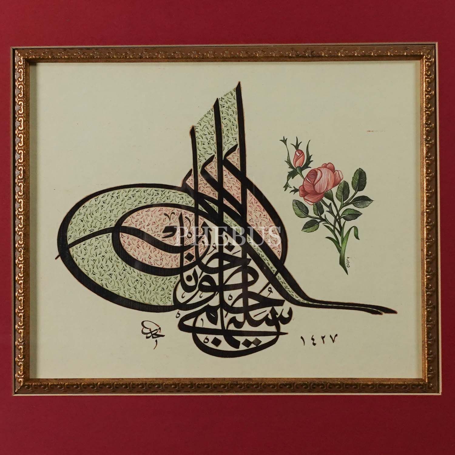 Tuğra formunda "Süleyman Hilmi Tunahan", hat: Necdet Altıparmak, tezhip: Büşra, 1427 tarihli, çerçeve ölçü: 47x42 cm...