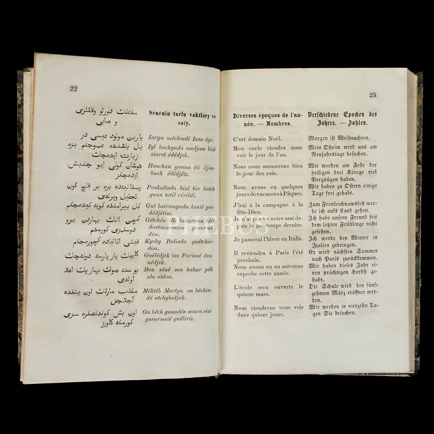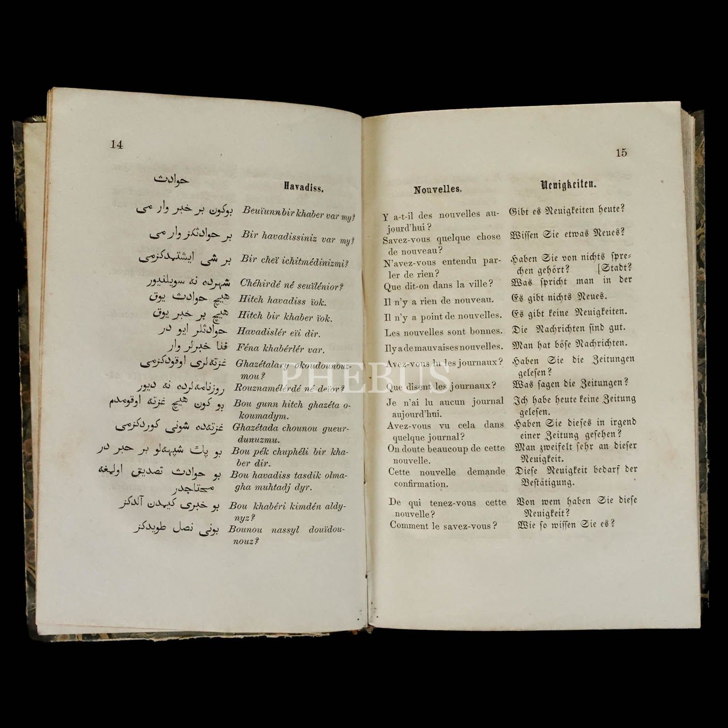Türk ve Fransız ve Alman Lisanlarından Müretteb Mükâleme Kitabı… Samuel Katırcıyan adlı bir Ermeni rahip tarafından hazırlanan bu eser; Fransızca - Almanca - Osmanlıca (ve Latin harfleriyle yazılmış Türkçe) dillerinde hava durumu, yeme - içme, mektup yazma, posta işleri, seyahat, avcılık, tiyatro, satranç, kâğıt oyunları, ticaret, yol sormak, besleme tutmak gibi konu başlıklarında ve doktor, aşçı, kunduracı, kitapçı - mücellit, berber gibi mesleklerde gerekli olabilecek pratik diyalogları içerir. *Döneminin deri sırtlı, orijinal cildi içinde...