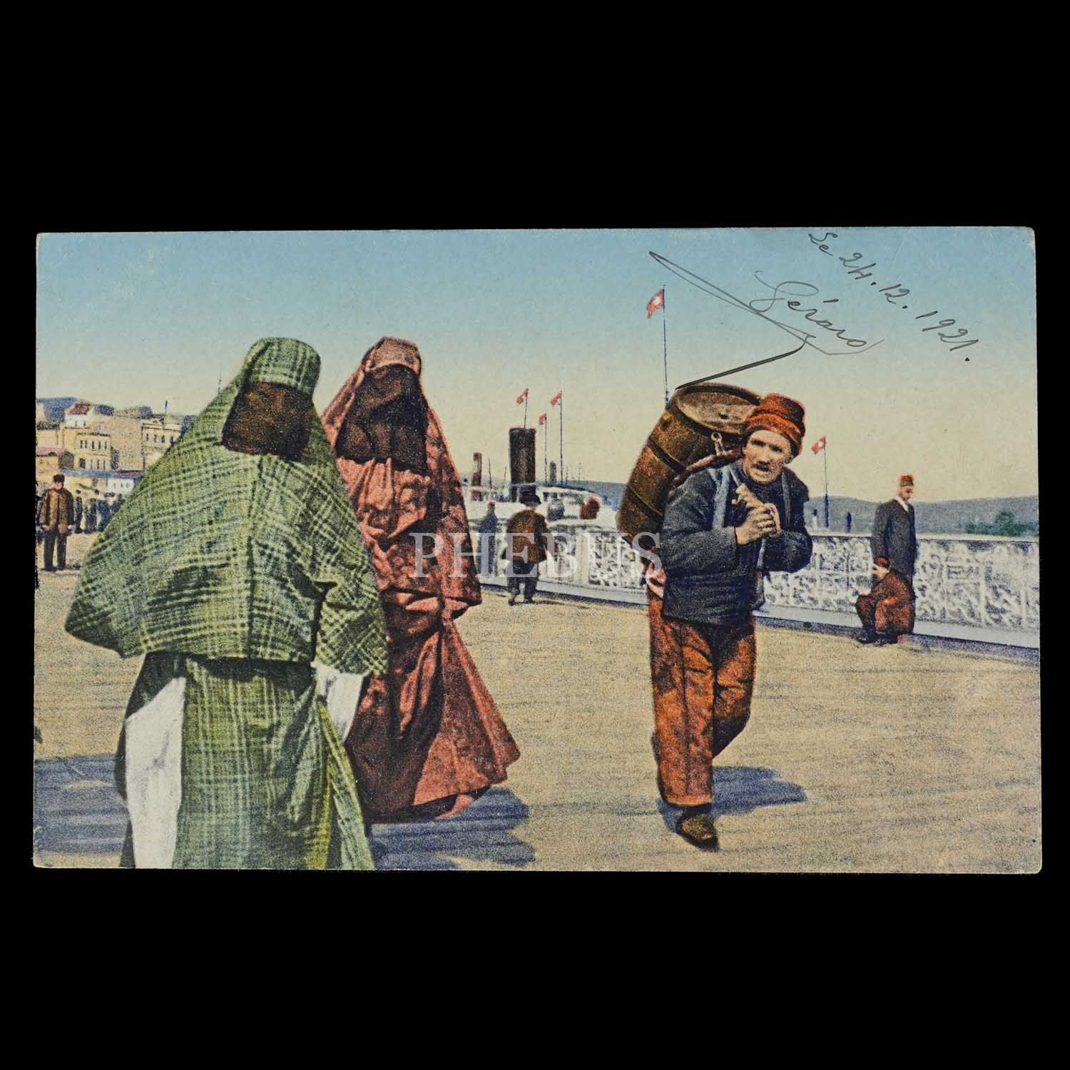 Galata Köprüsü üzerinde Türk kadınları ve hamal, "Constantinople - Dames turques", E.F. Rochat, Constantinople...