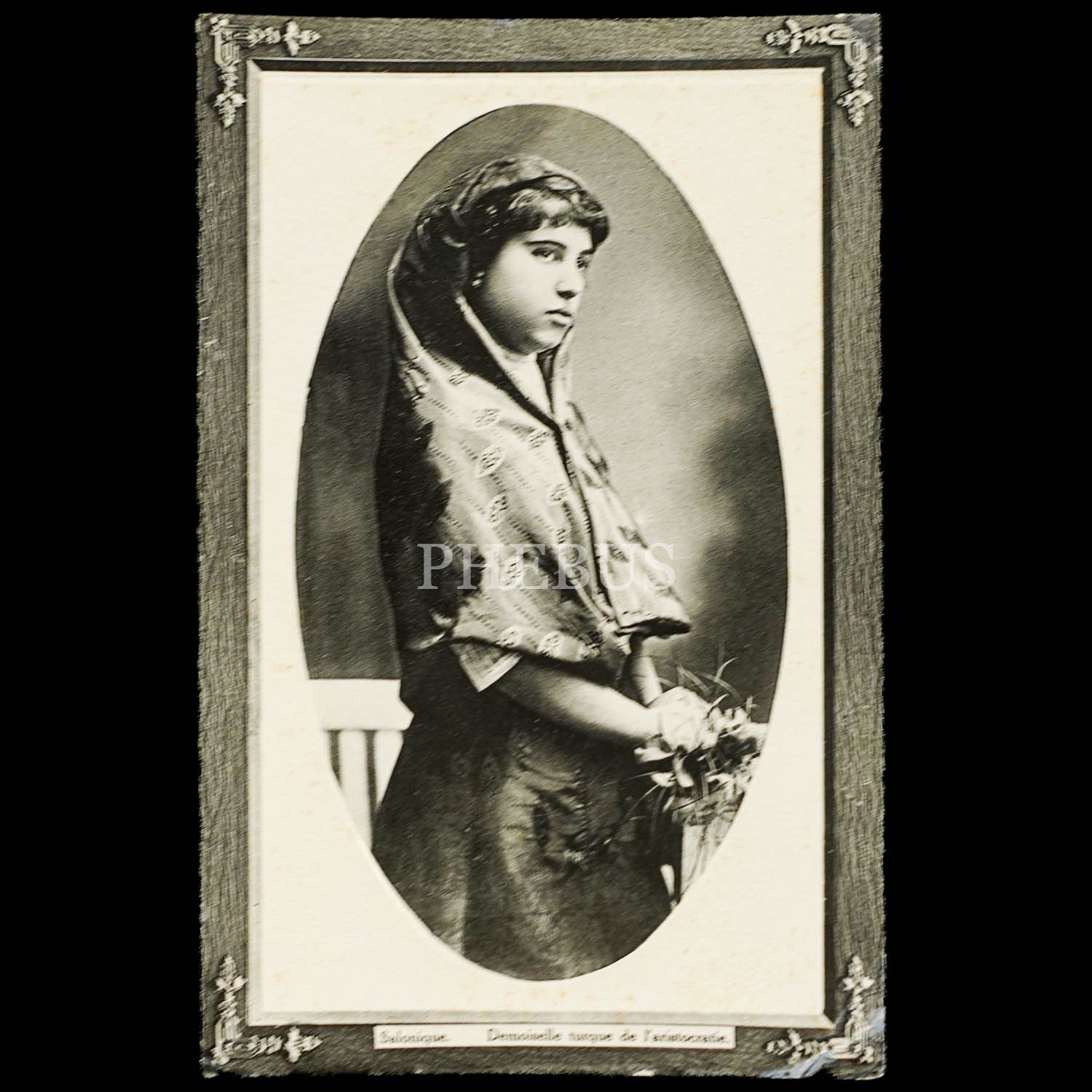 Selanikli bir soylu Türk kadını, gofre çerçeveli, "Salonique - Demoiselle turque de l´aristocratie", ed. Jacques Saul, Salonique...
