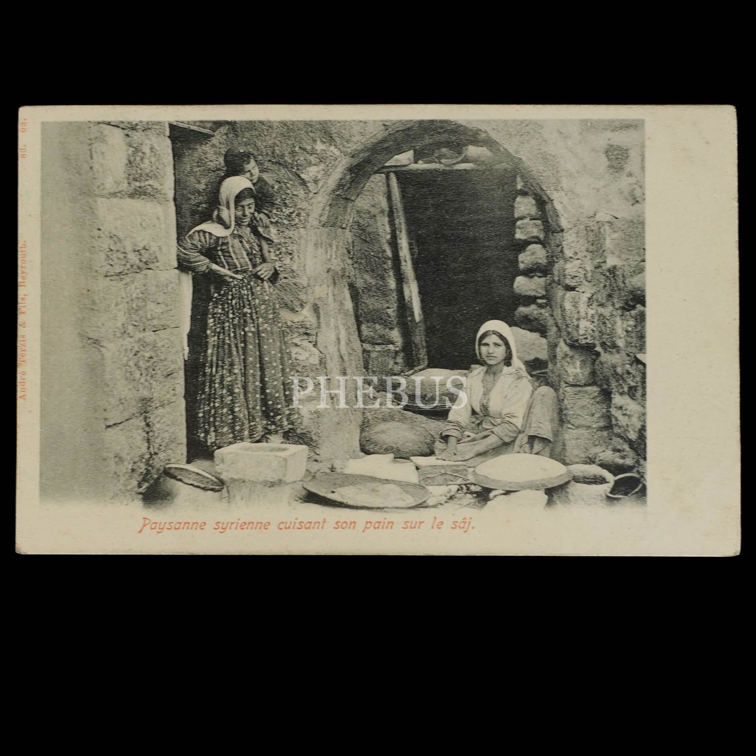 Ekmek pişiren Suriyeli köylü kadınlar, "Paysanne syrienne cuisant son pain sur le saj", ed. Andre Terzis & Fils, Beyrouth...