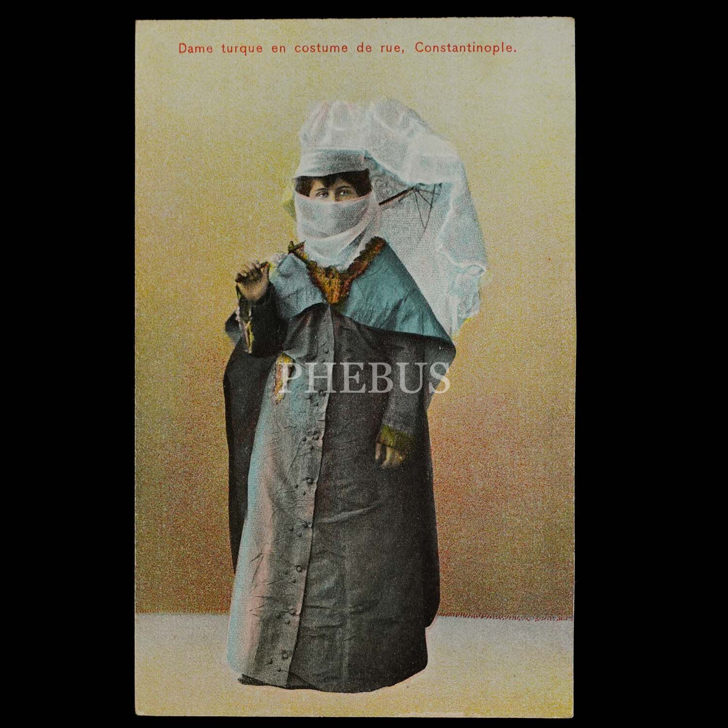Sokak kıyafeti ve şemsiyesiyle asil bir Türk kadını, "Dame turque en costume de rue, Constantinople"...