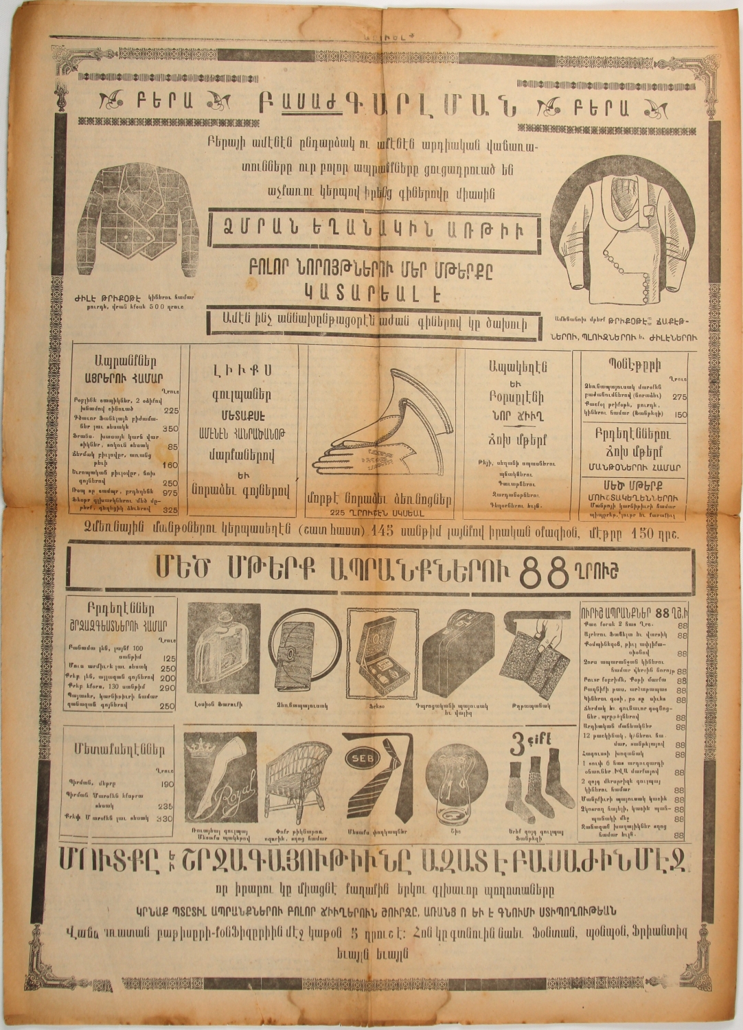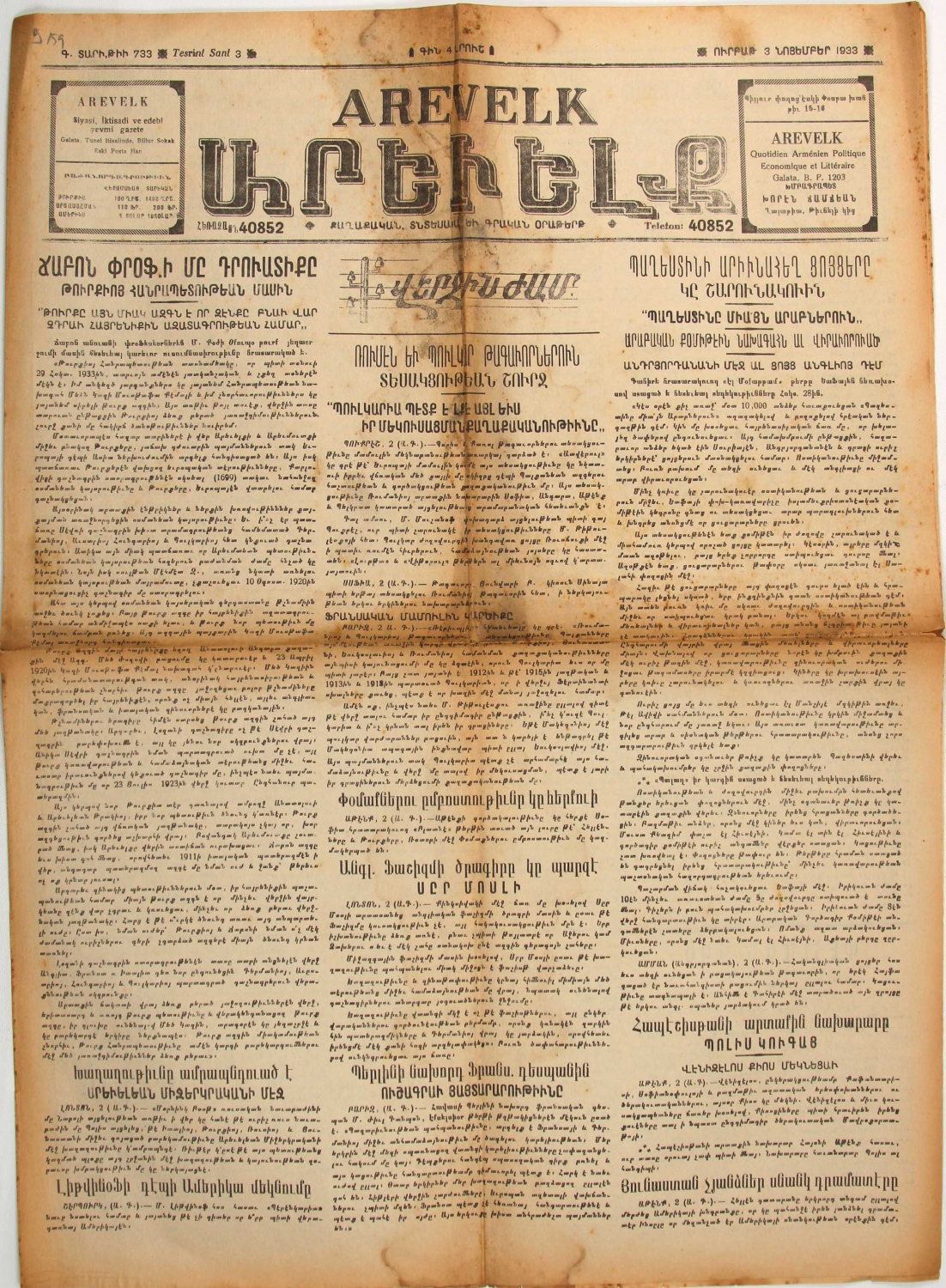 Ermenice Arevelk gazetesi, 1933, haliyle 40x56 cm