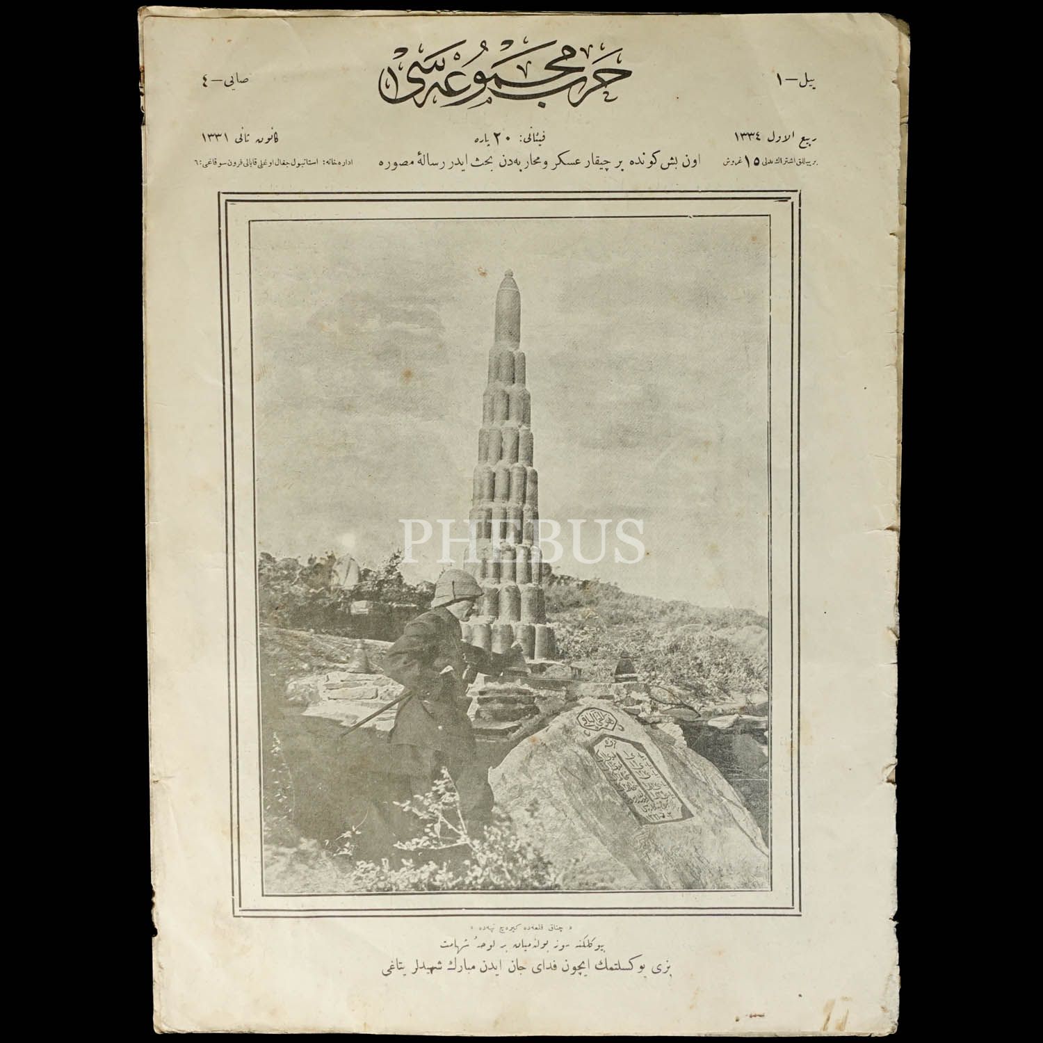 Rebiülevvel 1334 tarihli mecmuanın kapak yazısı: "Büyüklüğüne söz bulunamayan bir levha-i şehamet. Bizi yükseltmek için feda-yı can eden mübarek şehidler yatağı" *Derginin ön ve arka kapağı metinden ayrılmıştır.