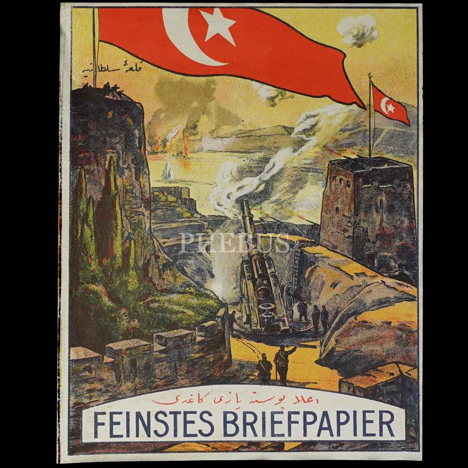 Çanakkale Boğazı´nın Asya Kıtası´nda yer alan Kale-i Sultaniye´den (Çimenlik Kalesi) top atışı görüntülerini içeren "Feinstes Briefpapier" marka, Osmanlıca-Fransızca yazılı posta kağıdı reklamı, 19x24 cm...