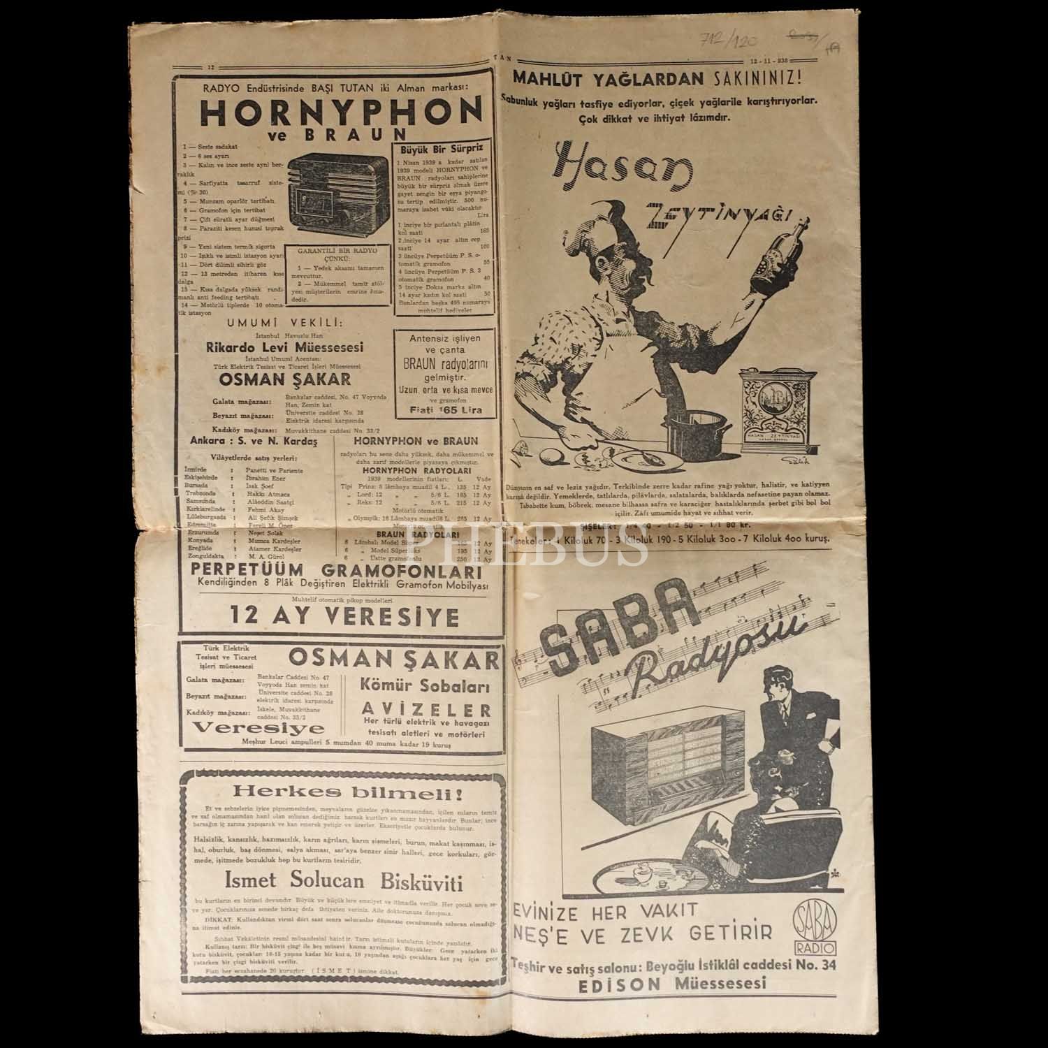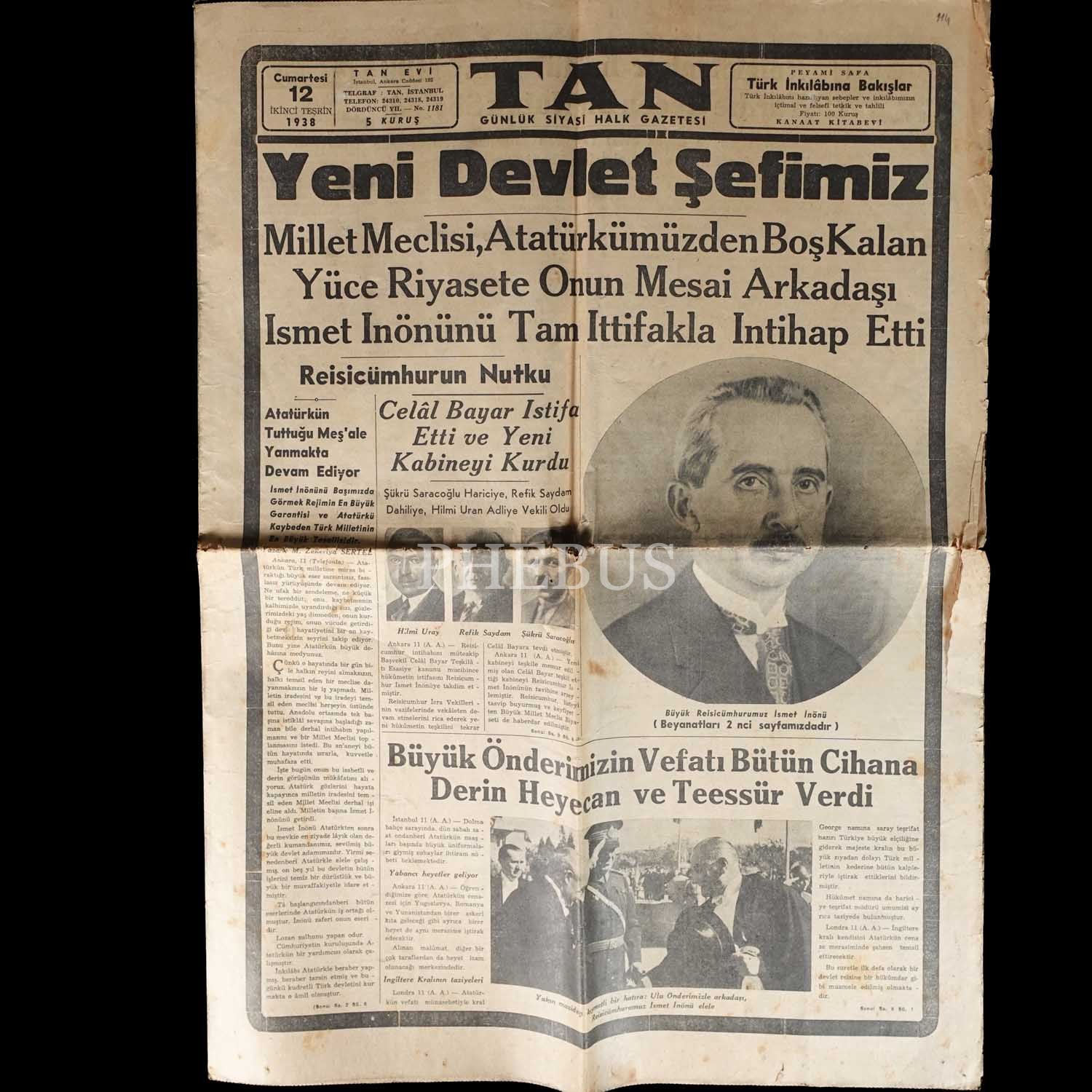 "Yeni Devlet Şefimiz" manşetiyle, Mustafa Kemal Atatürk´ün vefatıyla boşalan Cumhurbaşkanlığı makamına TBMM kararıyla İsmet İnönü´nün seçildiğini duyuran TAN gazetesi, 12 İkinci Teşrin (Kasım) 1938, 12 sayfa, 43x59 cm...