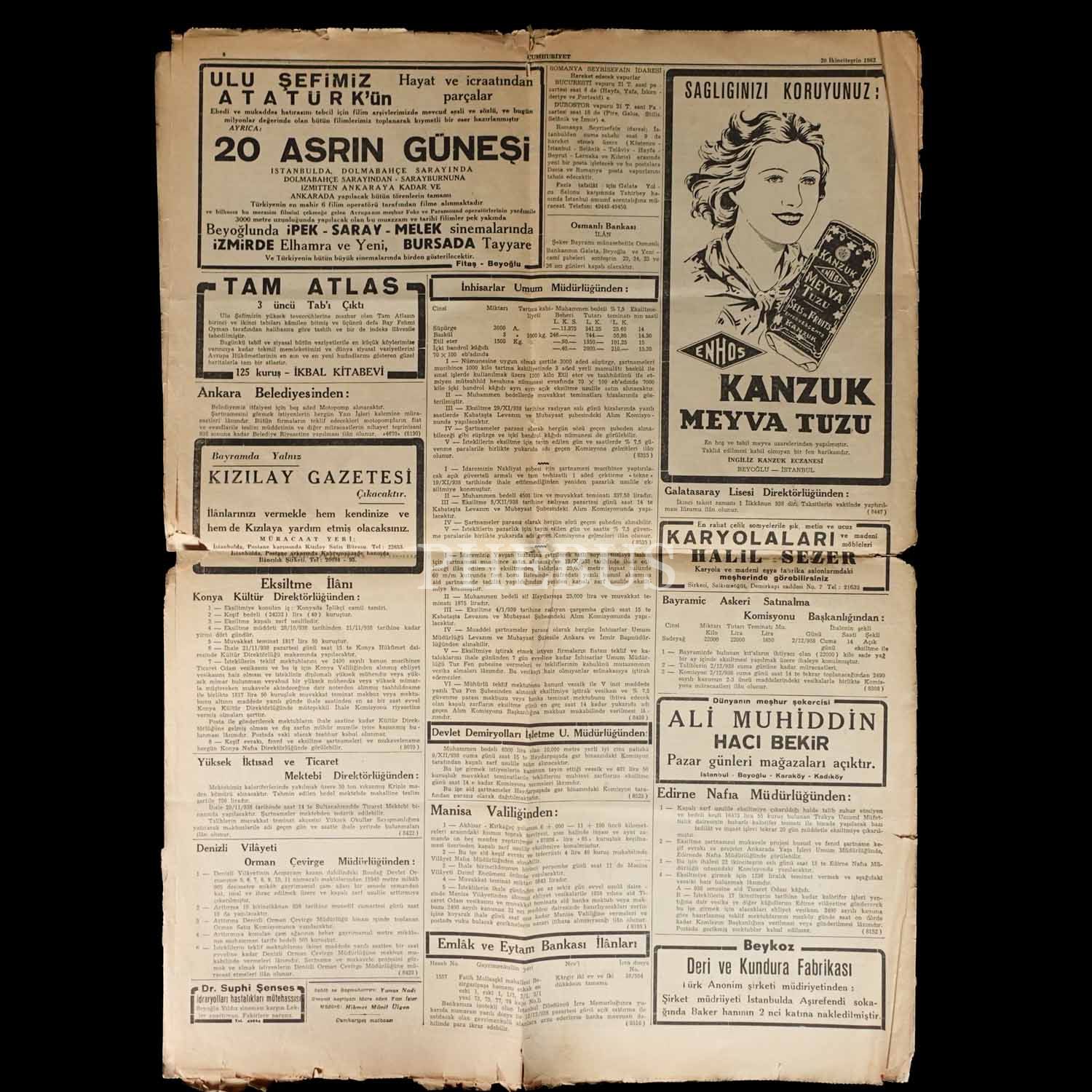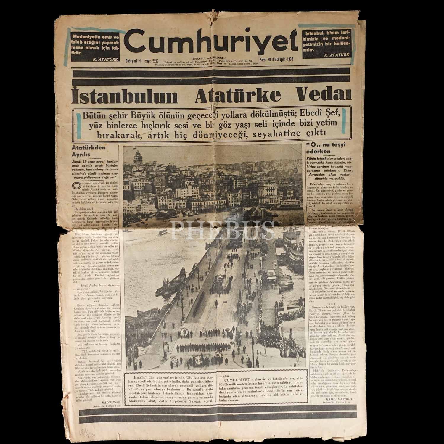"İstanbulun Atatürke Vedaı" manşetiyle, Mustafa Kemal Atatürk´ün naaşının İstanbul´dan Ankara´ya törenle uğurlanışını konu alan CUMHURİYET gazetesi, 20 İkinciteşrin (Kasım) 1938, 8 sayfa, 45x62 cm...