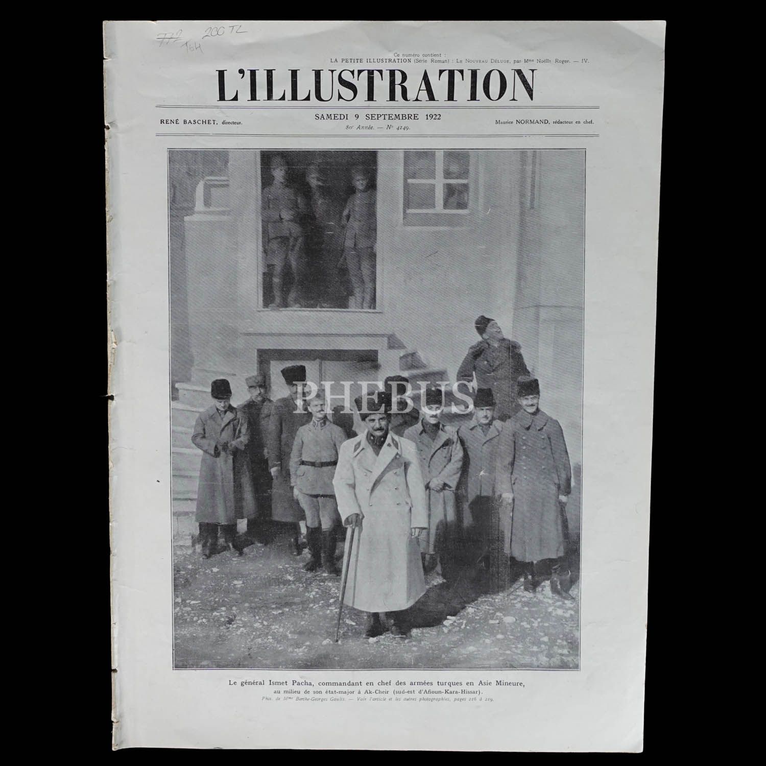 İsmet (İnönü) Paşa´yı, Akşehir´de bulunan karargahının önünde maiyetiyle birlikte gösteren kapağıyla L´ILLUSTRATION dergisi, 9 Eylül 1922, No. 4149, 31x41 cm...