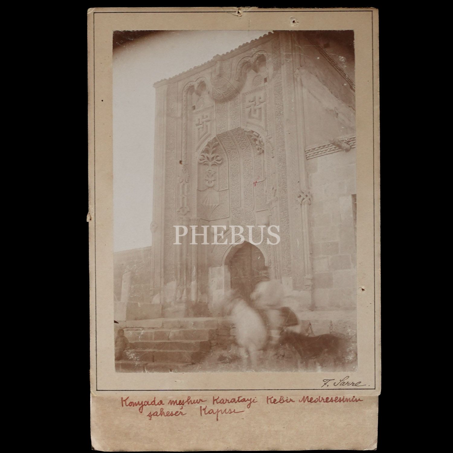 Konya, Selçuklu´da bulunan Karatay Medresesi kapısının Osmanlı dönemine ait albümin baskı fotoğrafı, fotoğraf 10x14,5 cm, paspartu 14x19 cm...