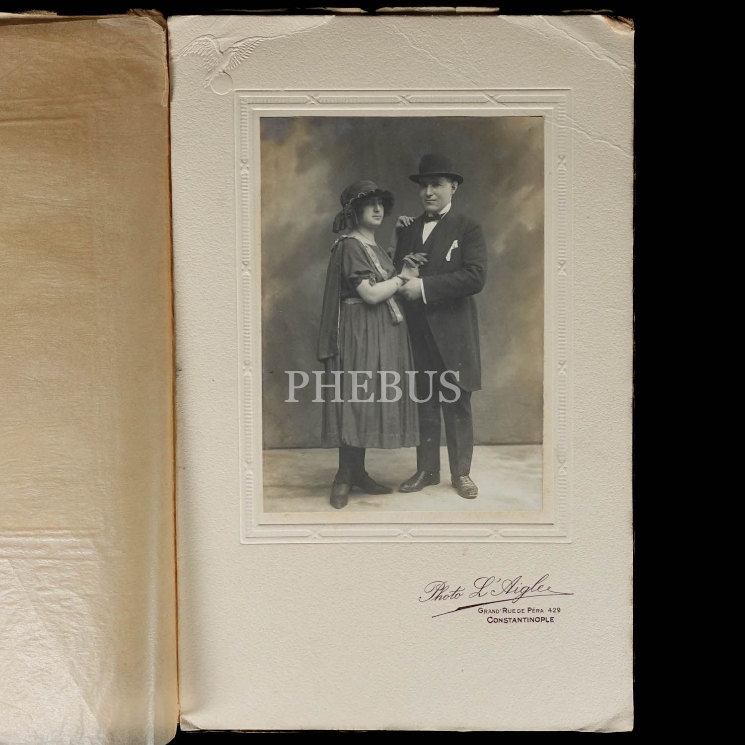 Şık giyimli bir levanten çiftin, L´Aigle Fotoğrafhanesi´nde (Constantinople) aldırdıkları hatıra fotoğrafı, fotoğraf 10x14,5 cm, paspartu 17x27 cm...