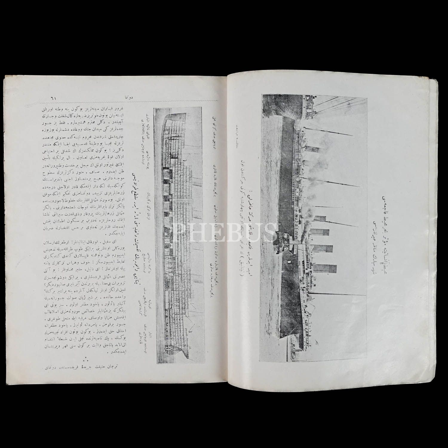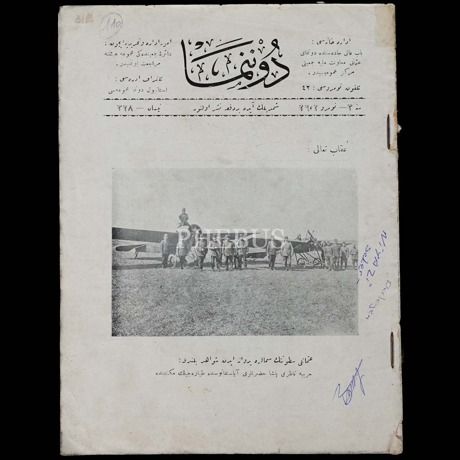 Donanma Dergisi´nin kapağında Osmanlı Devleti´nin ilk tayyare uçuşu denemelerinde Mahmud Şevket Paşa ve pilotların fotoğraflarına; iç sayfalarında o sene batan Titanik Gemisi´nin hikayesine, resimlerine ve planlarına yer veren Nisan 1338 tarihli sayısı, 18x24 cm...